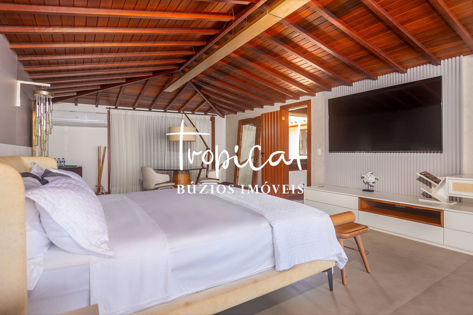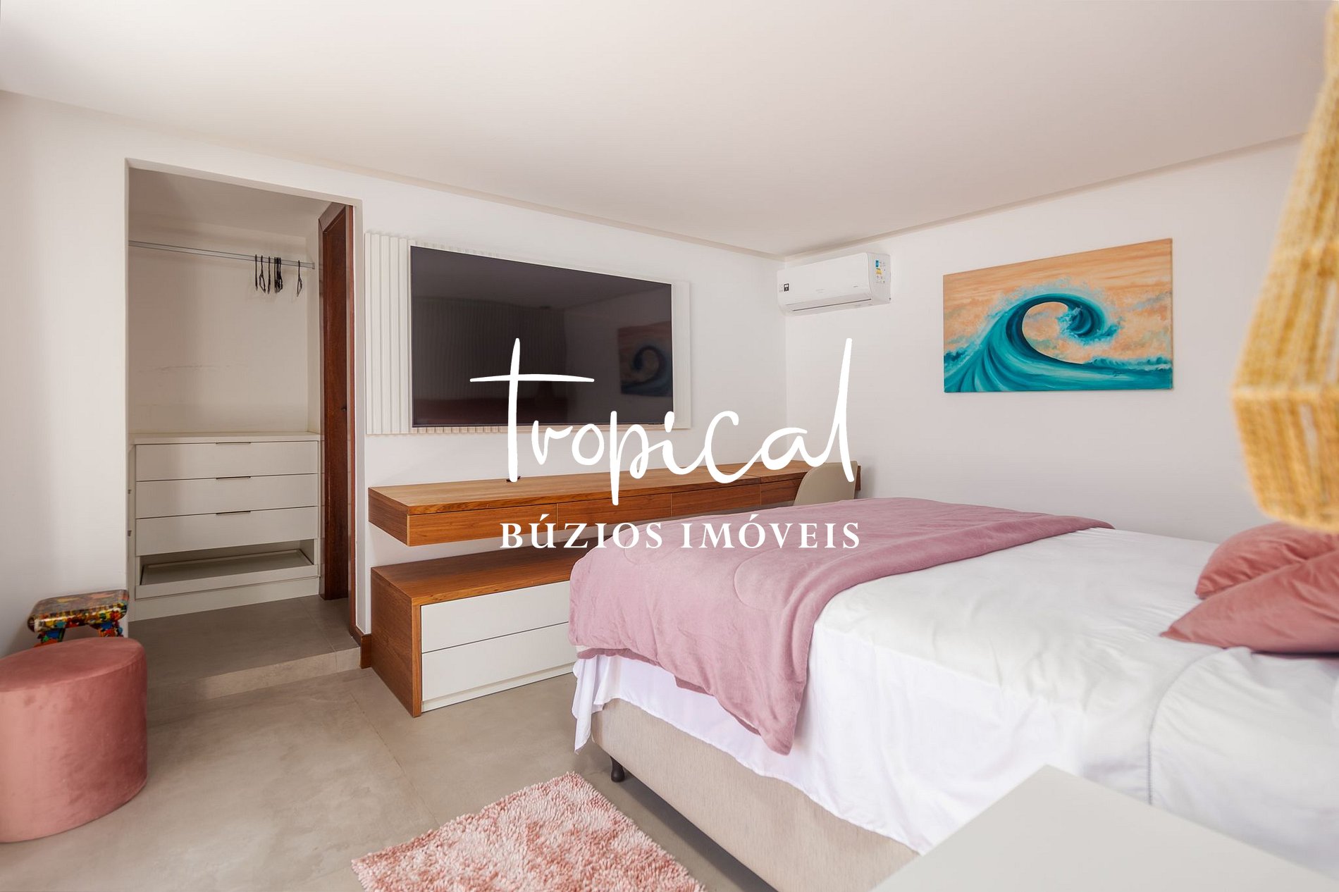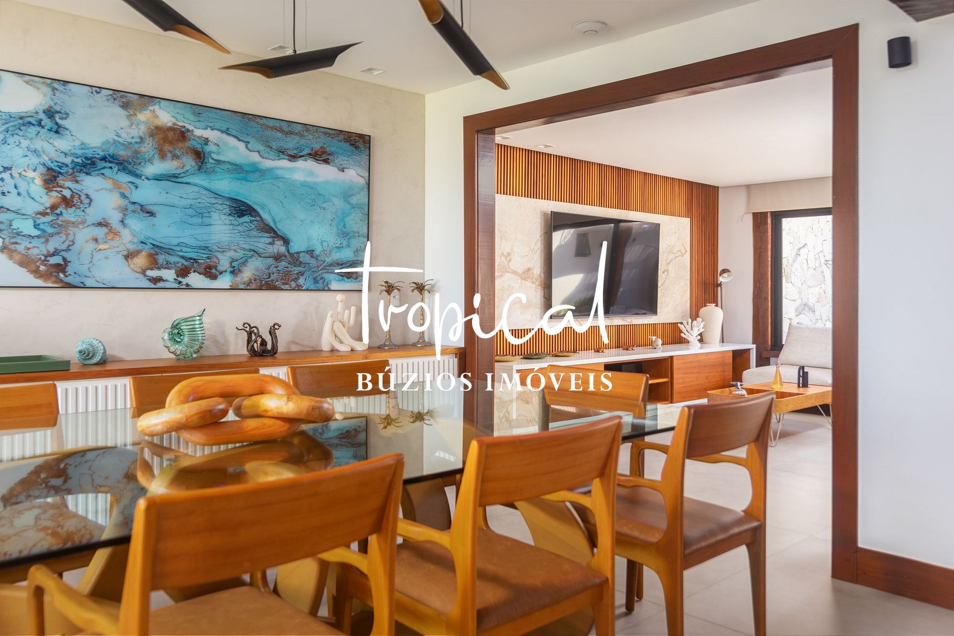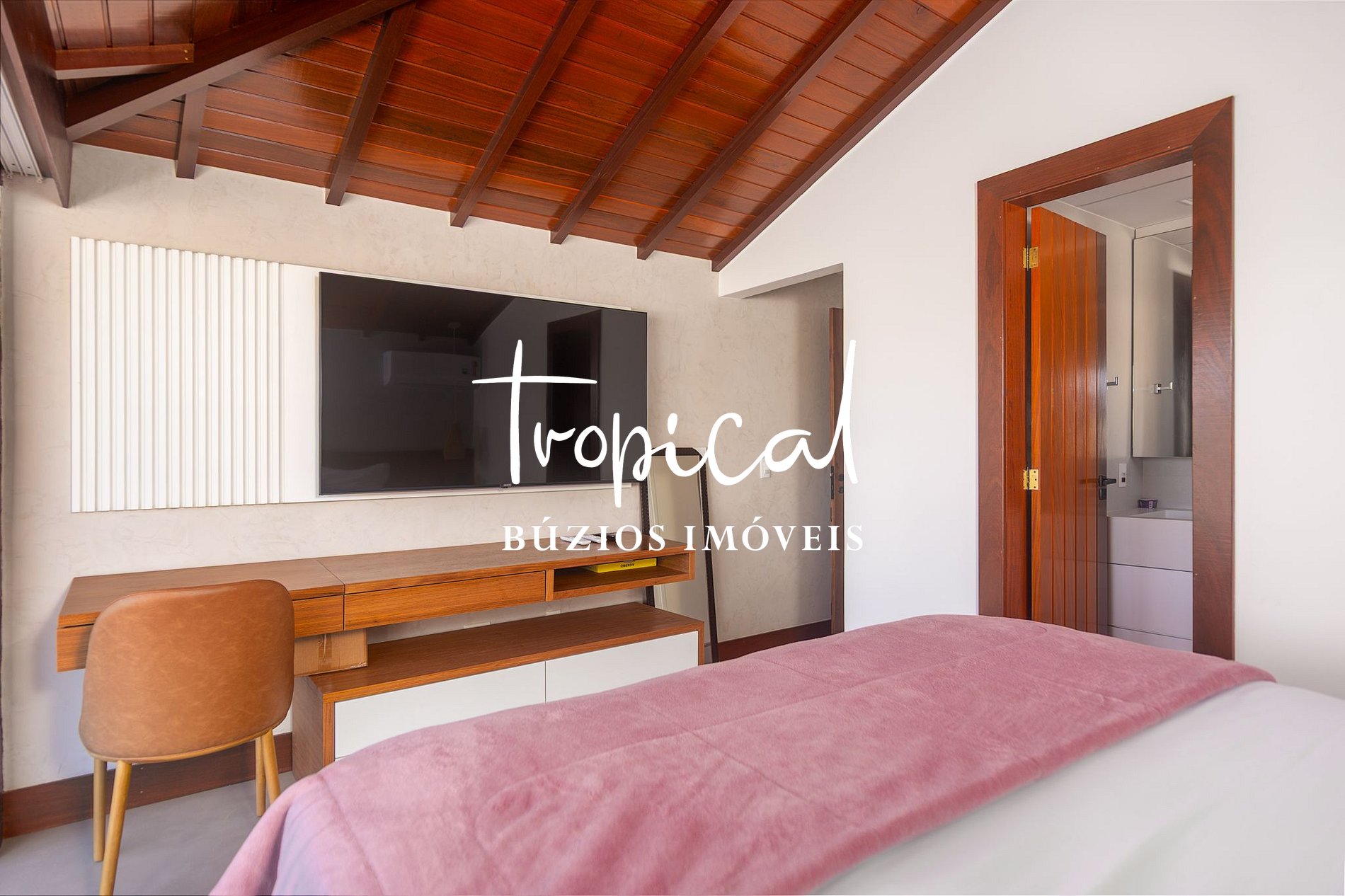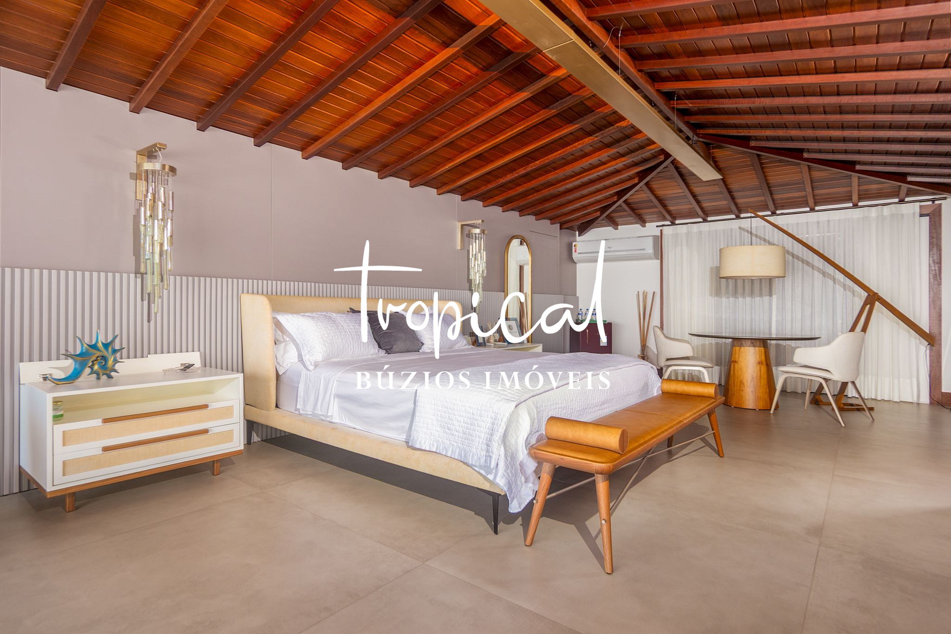 Diferenciais: todas as suítes com ar-condicionado split e banheiros privativos; suíte master com cama king, closet, equipamento de academia e vista direta para o mar da Ferradura; quartos externos de apoio, ideais para convidados que desejam mais privacidade ou para staff; TVs em praticamente todos os quartos, garantindo conforto e entretenimento individual.
