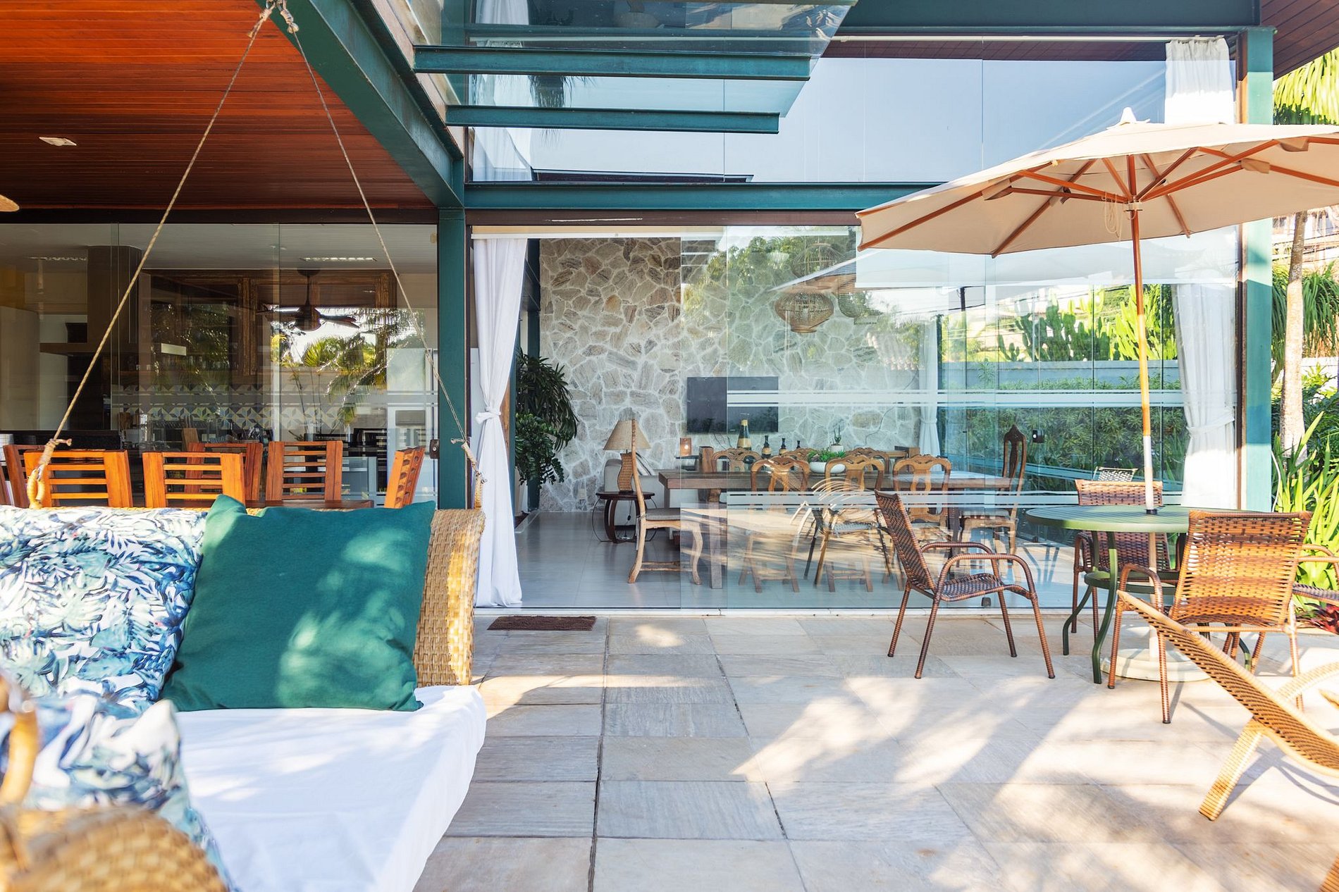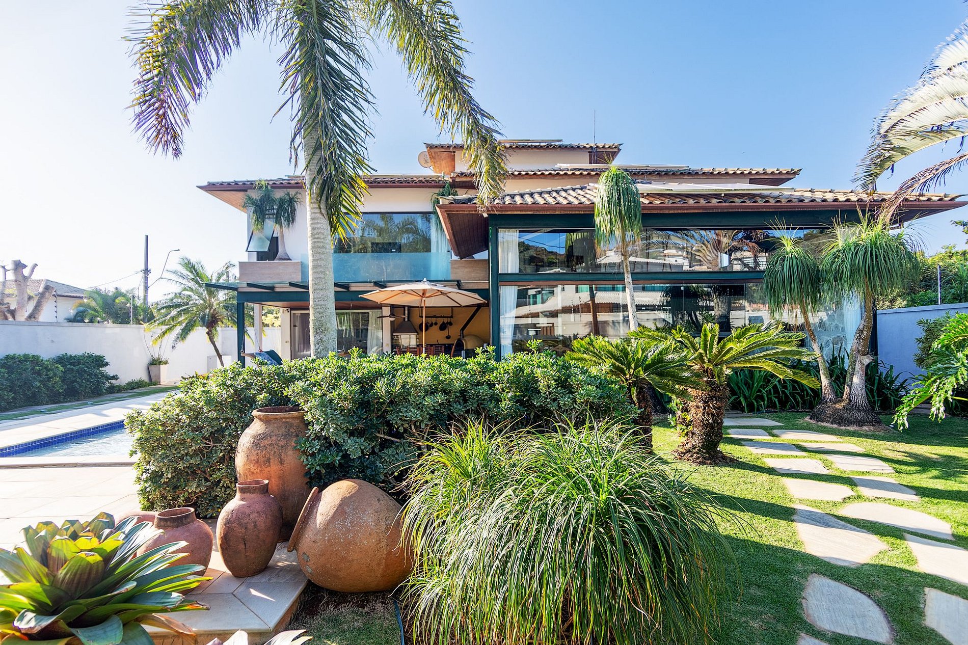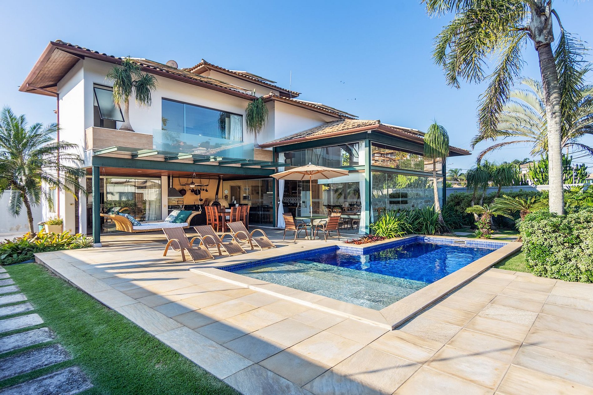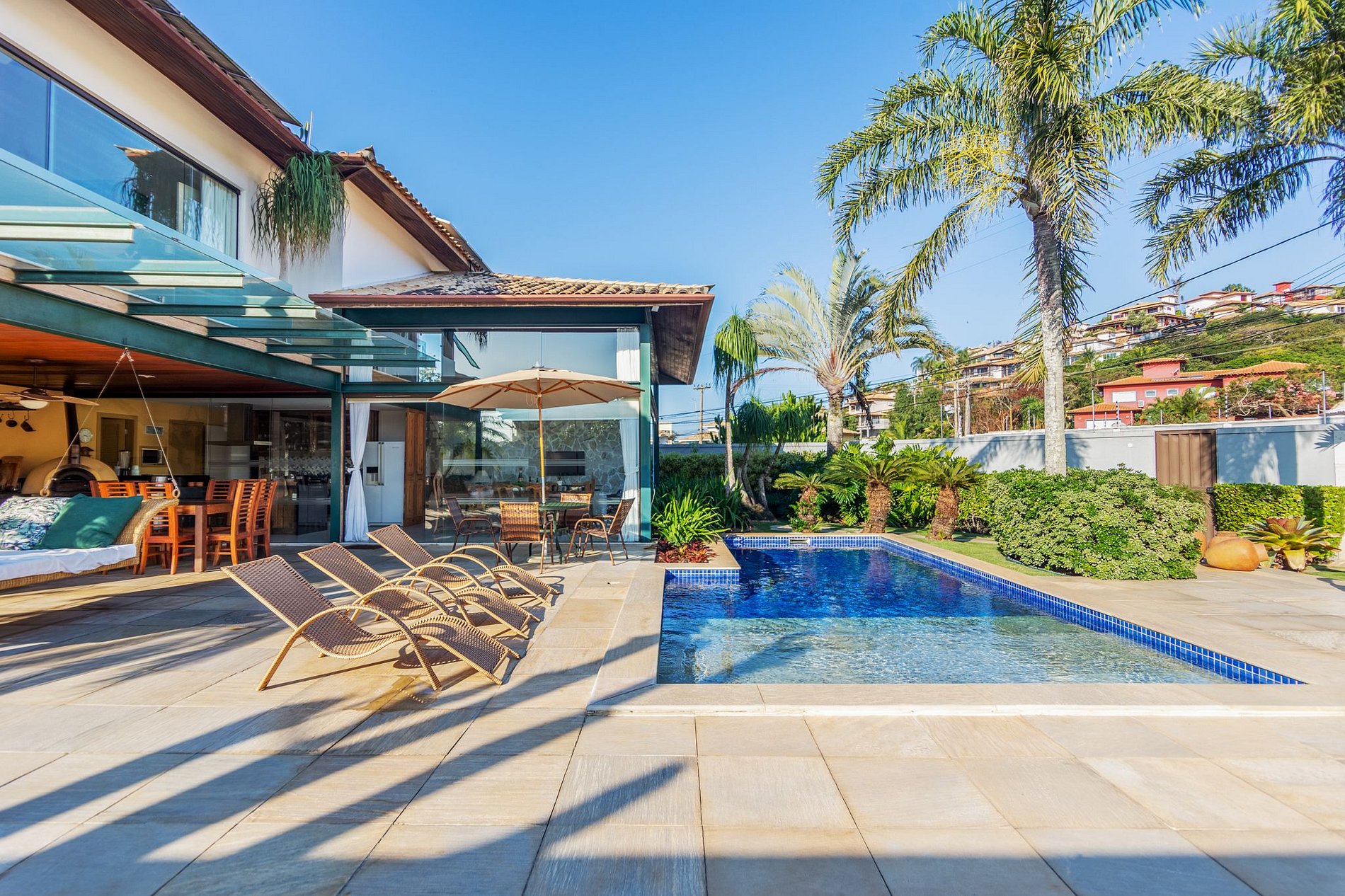 Casa ampla e finamente decorada, com 5 suítes completas, área gourmet com piscina privativa, churrasqueira e forno de pizza, jardim ornamental, cozinha em conceito aberto e sala de estar com pé-direito alto e paredes envidraçadas. Possui garagem para 4 carros e espaço para estacionamento na rua em frente ao portão (rua tranquila).