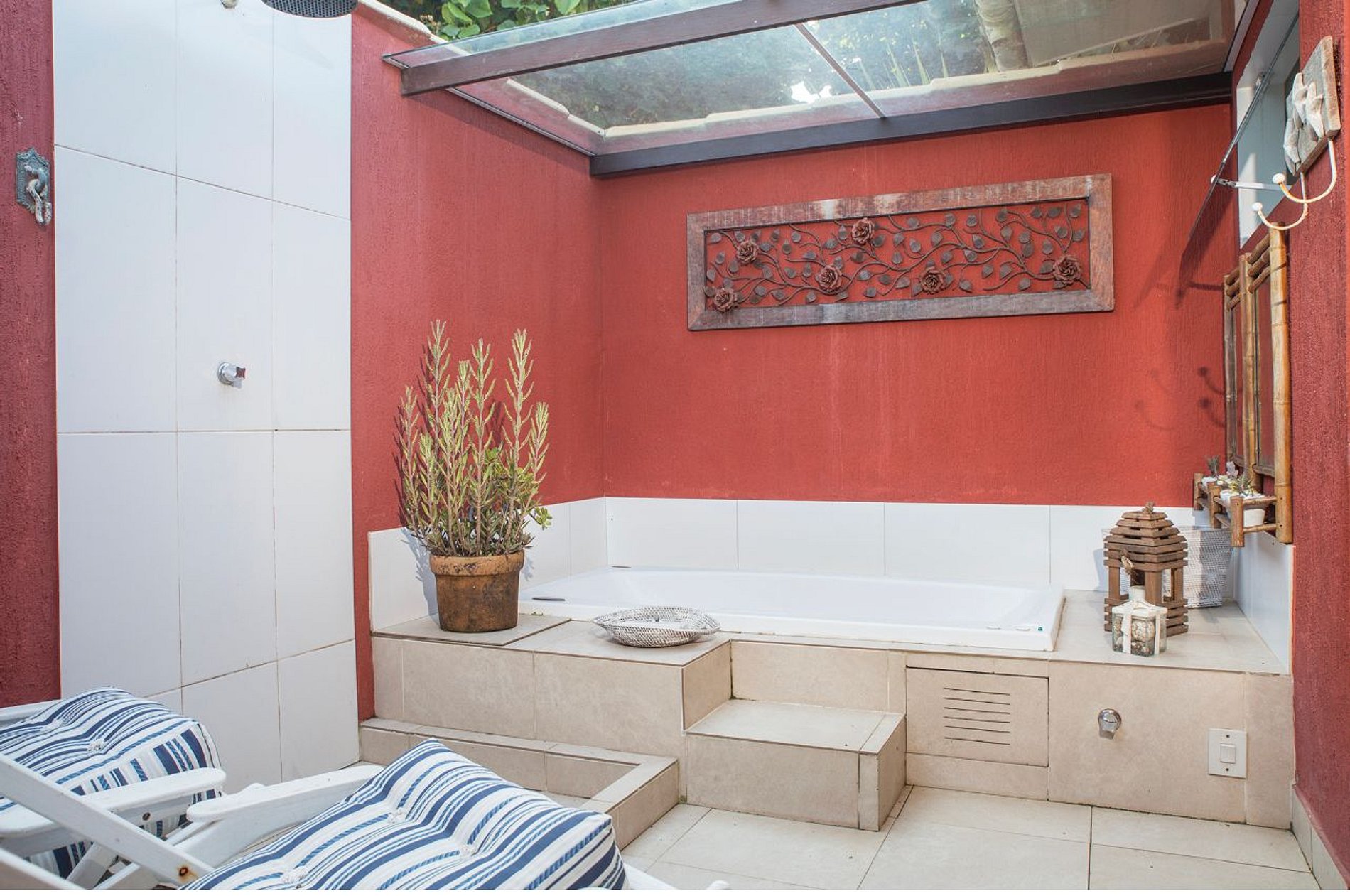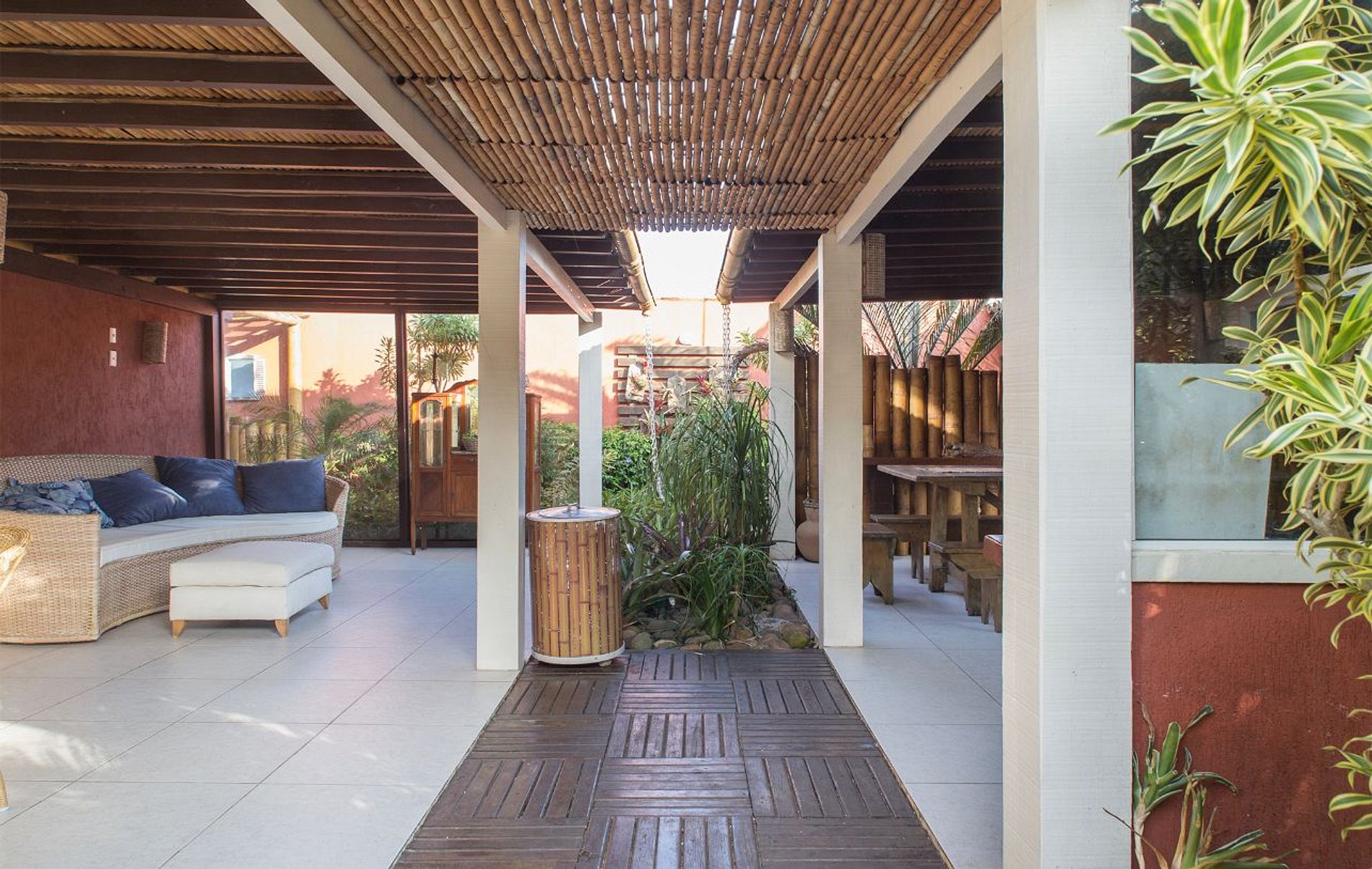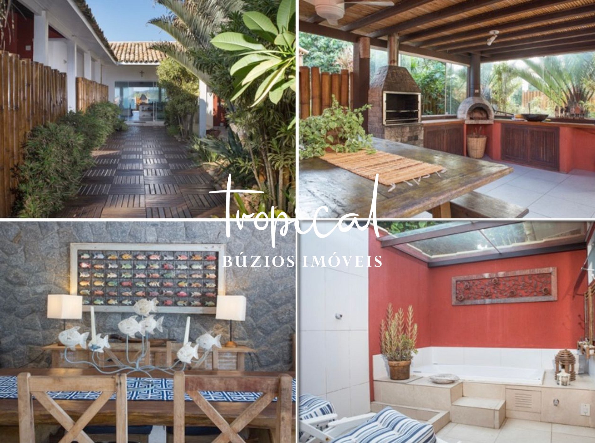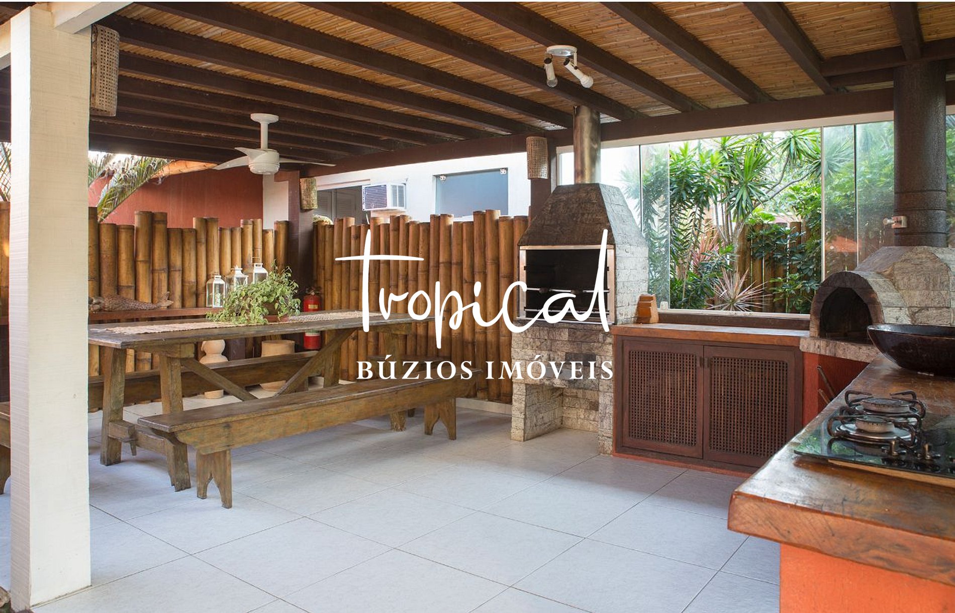 A sala de estar ampla é o espaço perfeito para relaxar e socializar, com móveis confortáveis e uma decoração rústica típica de Búzios. A cozinha totalmente equipada oferece tudo o que você precisa durante sua estadia, e o espaço gourmet coberto conta com churrasqueira, forno à lenha, fogão e uma mesa grande.