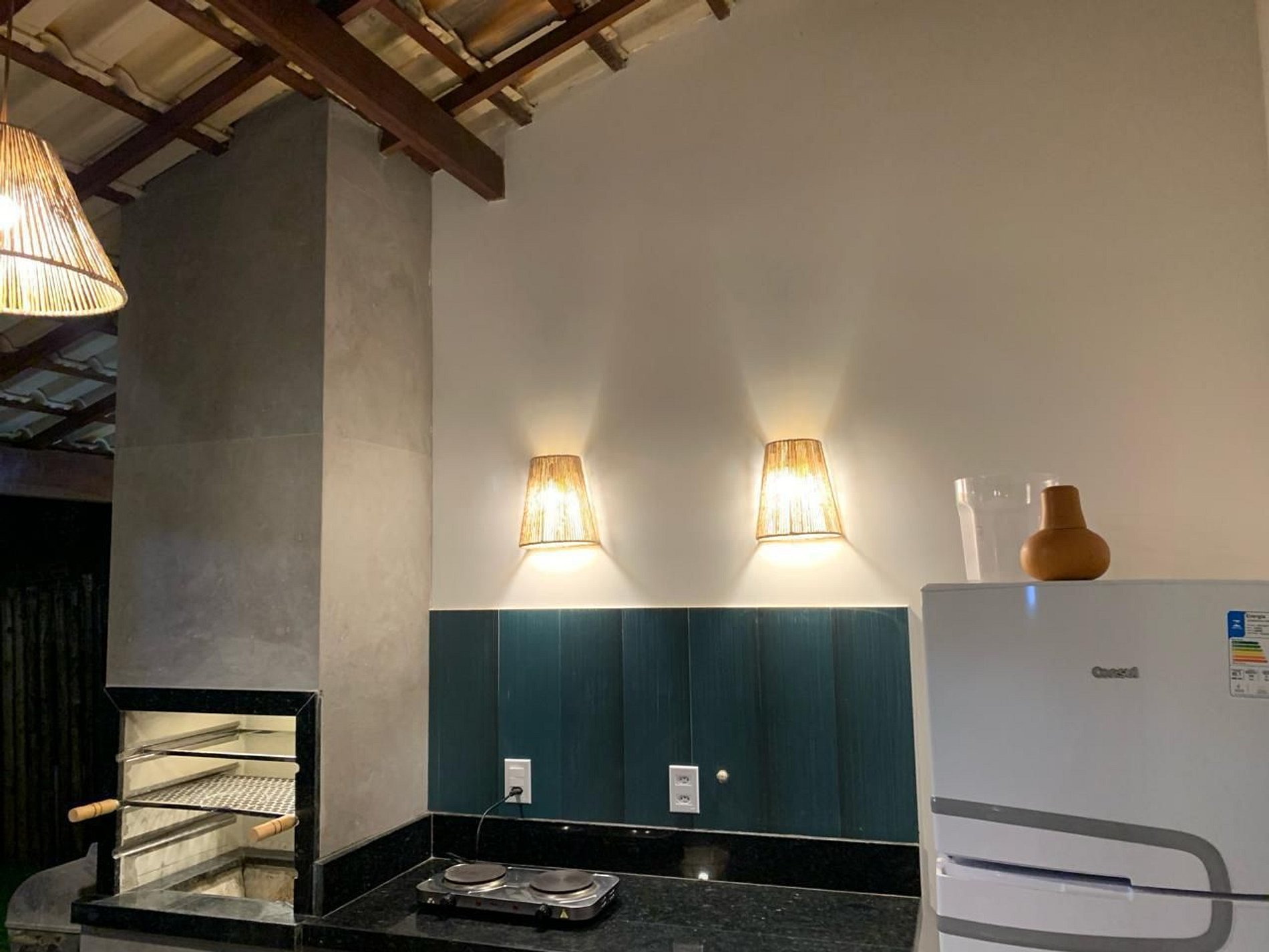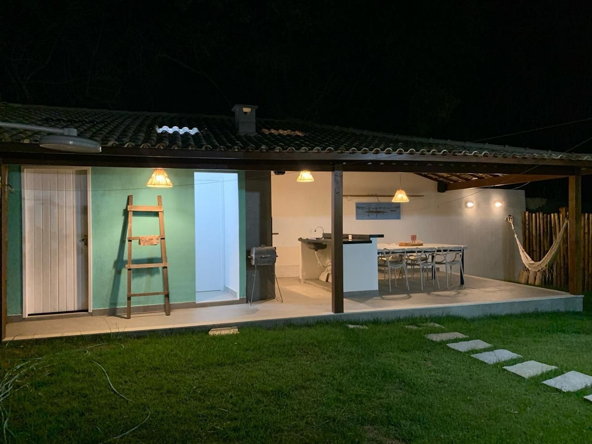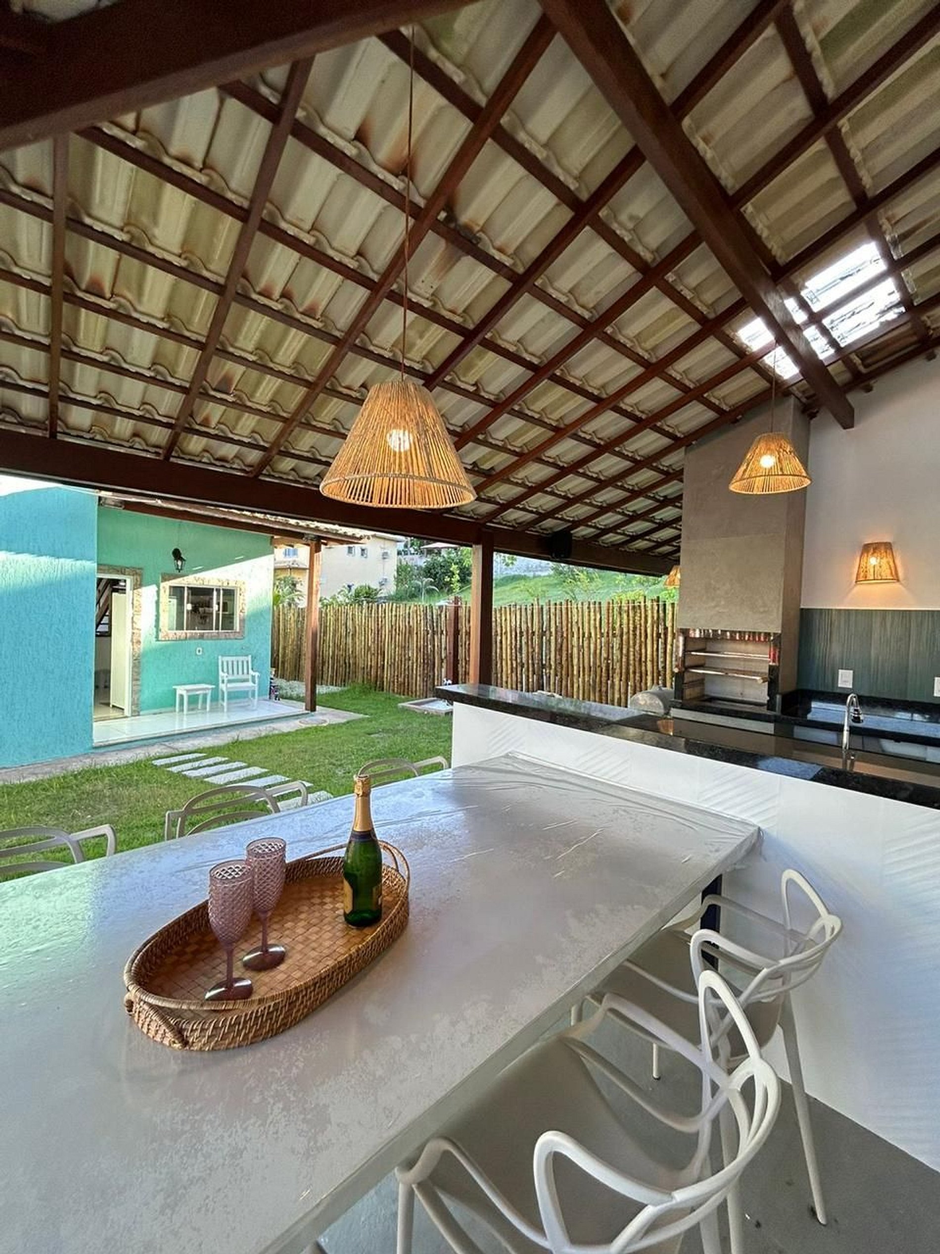 A casa é extremamente bem iluminada, proporcionando um ambiente acolhedor e agradável. A sala de estar possui um sofá espaçoso e uma TV smart. A cozinha americana é totalmente equipada com todos os utensílios necessários para sua estadia. A casa conta com 4 suítes, todas com camas confortáveis e ar-condicionado split, garantindo uma noite de sono tranquila e revigorante.