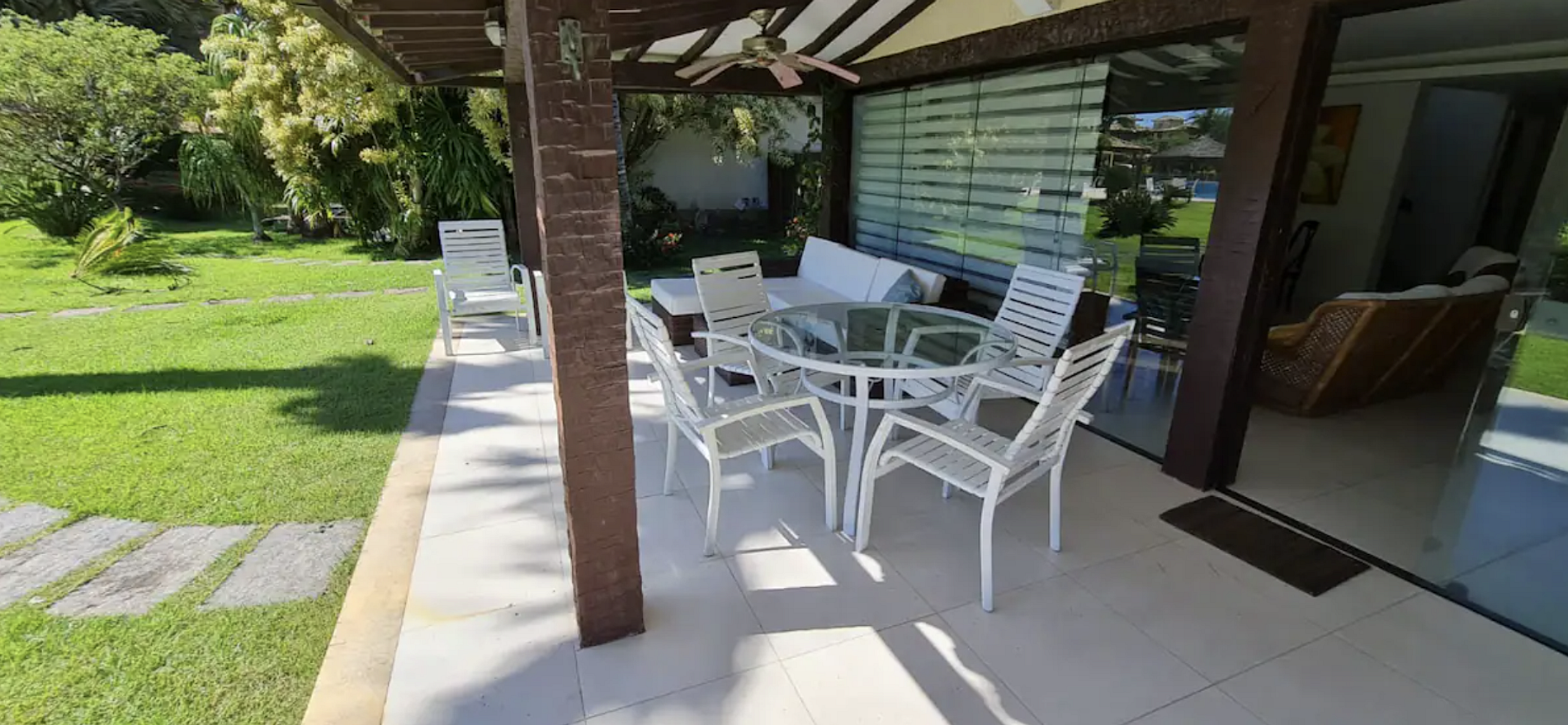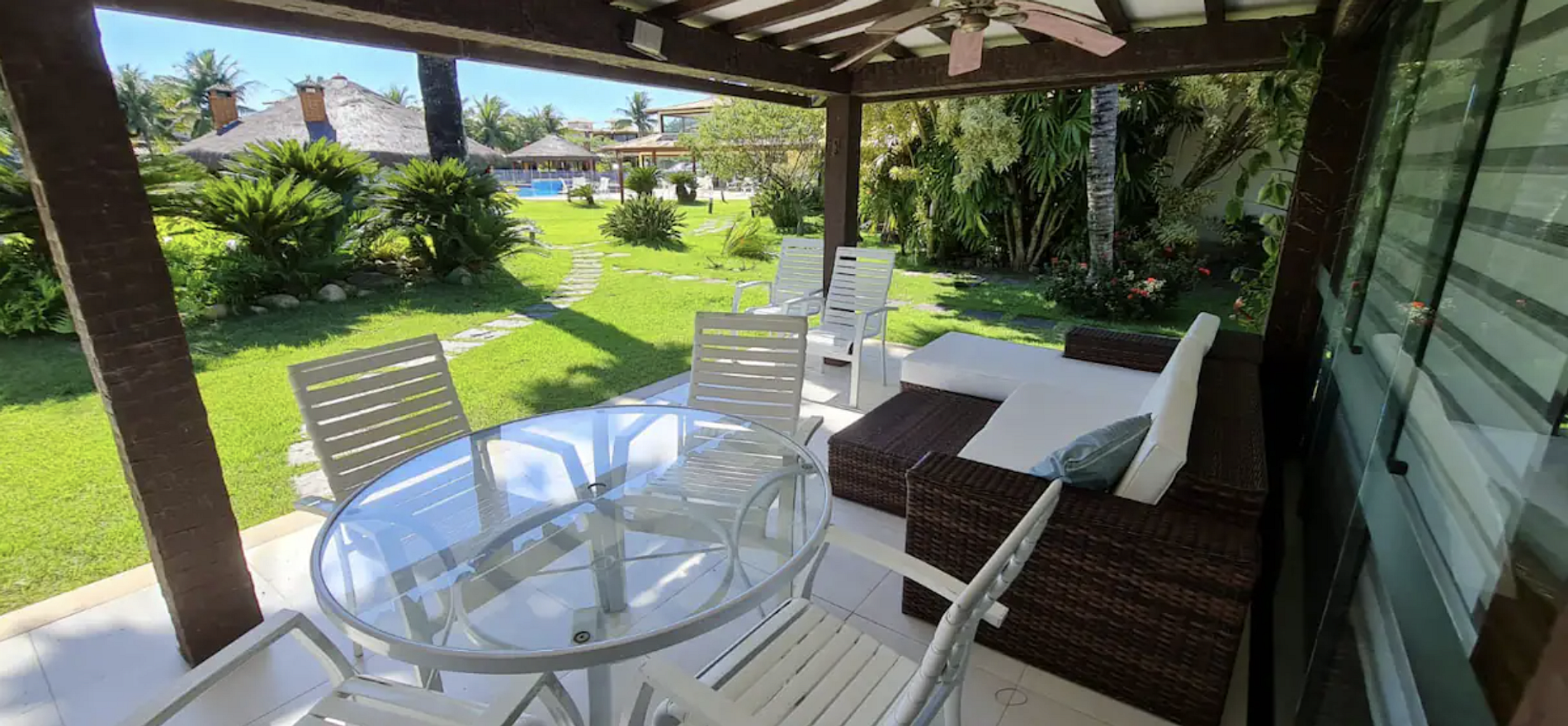 A casa, agradável e ampla, com 4 suítes, fica no fundo do condomínio, com um belo jardim na frente, vista para a piscina e próxima ao quiosque com churrasqueira e forno à lenha.