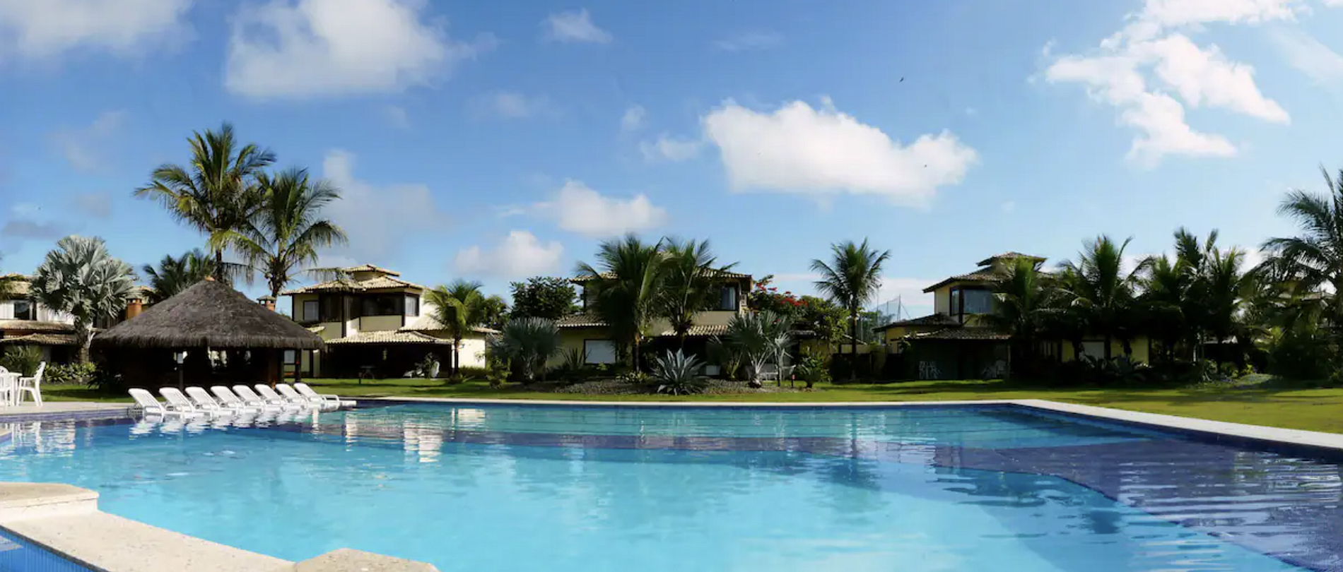 A casa, agradável e ampla, com 4 suítes, fica no fundo do condomínio, com um belo jardim na frente, vista para a piscina e próxima ao quiosque com churrasqueira e forno à lenha.