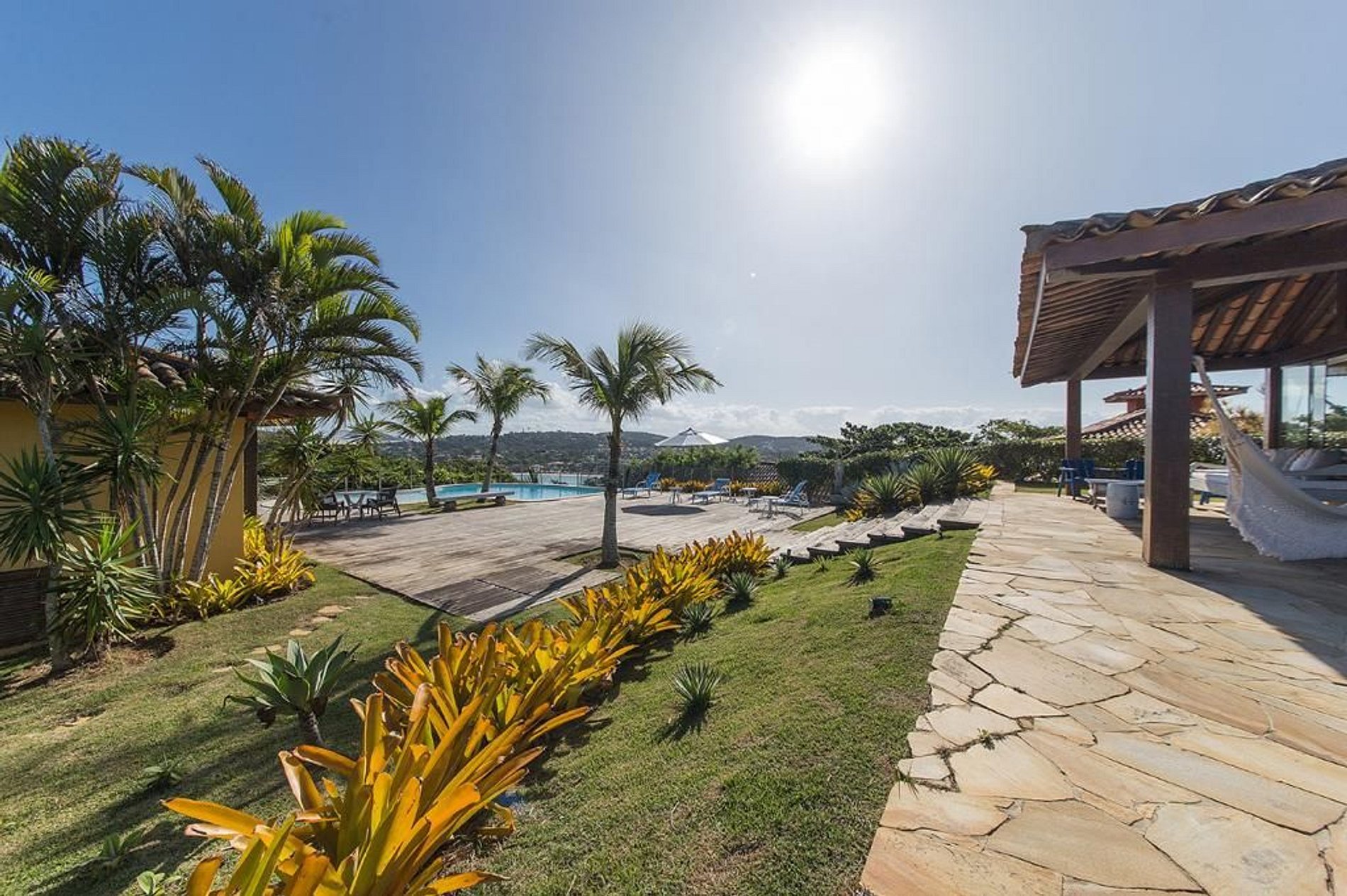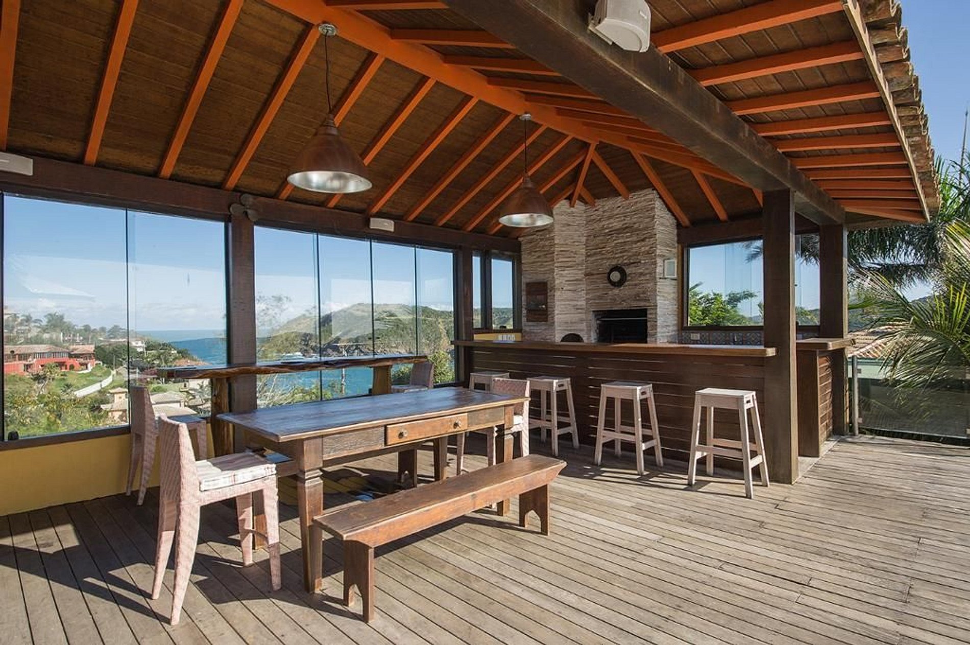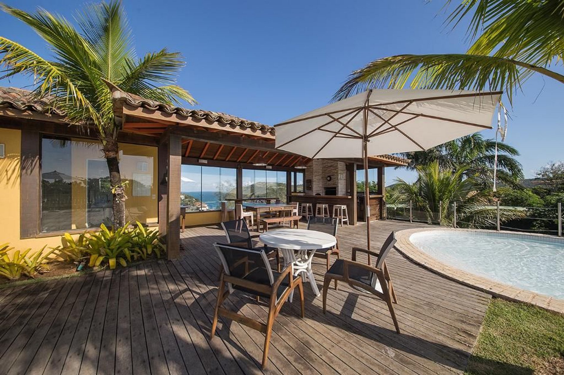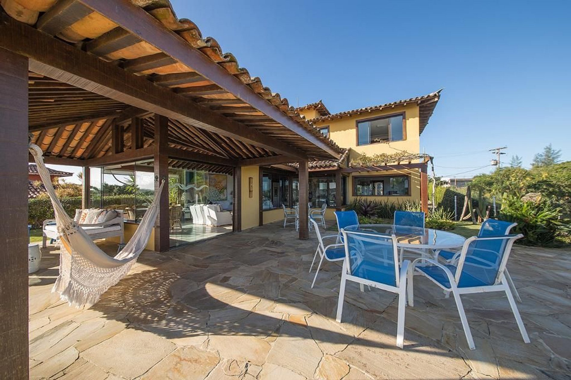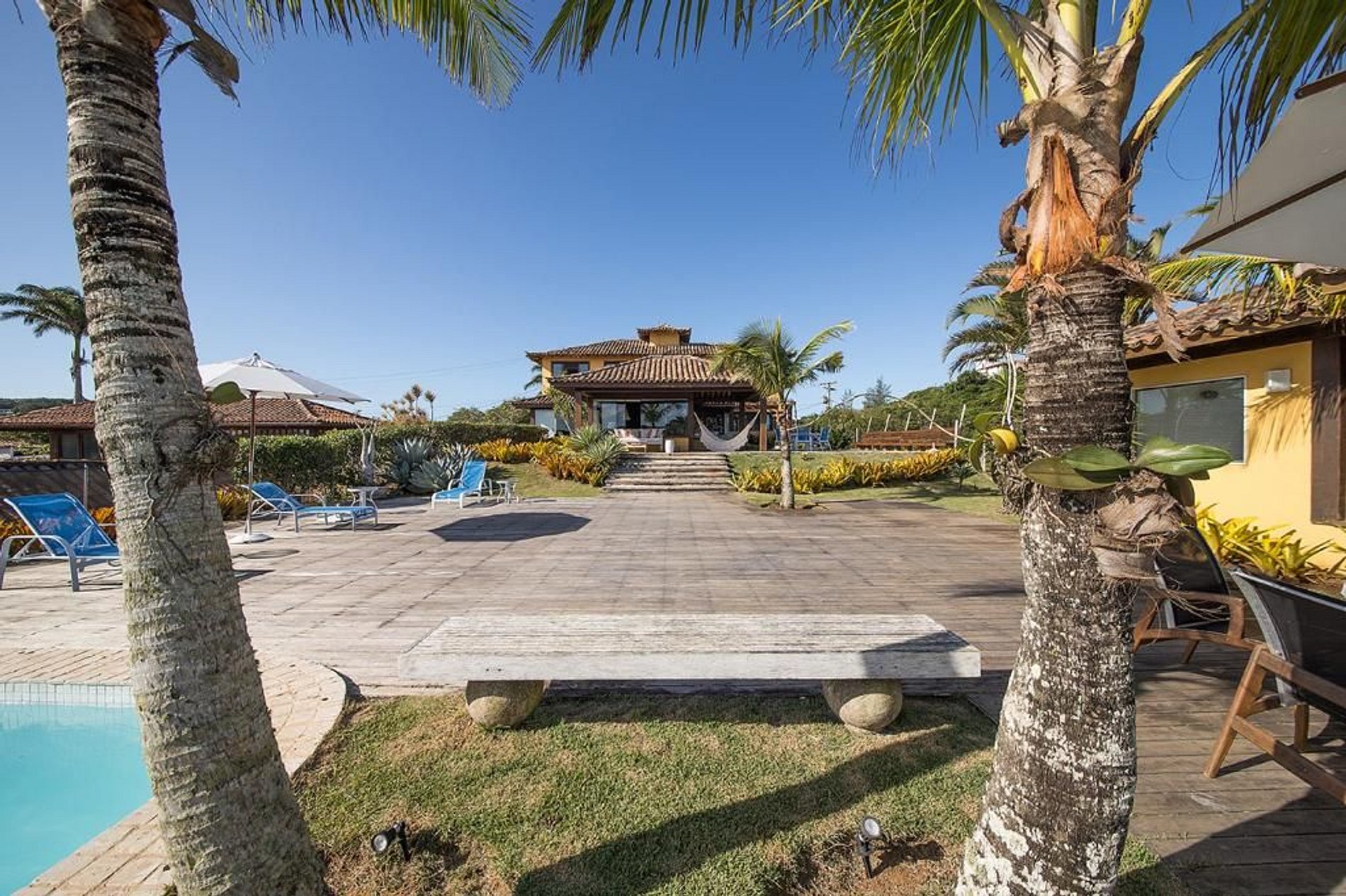A casa se abre para uma varanda coberta com mesa e cadeiras, e redes para relaxar. Os jardins bem cuidados abrem caminho para o deck de madeira, piscina com borda infinita, espaço gourmet com churrasqueira, forno de pizza, lavabo e sauna com vista para o mar.