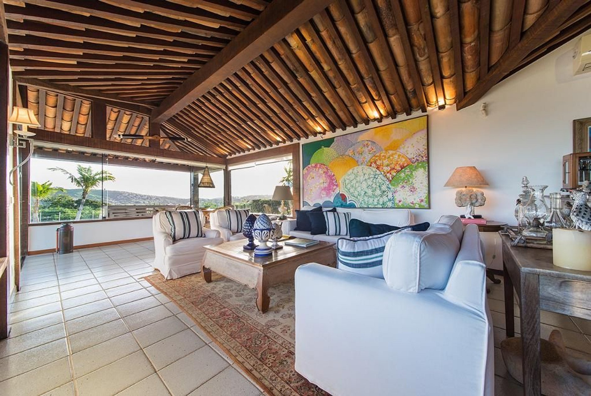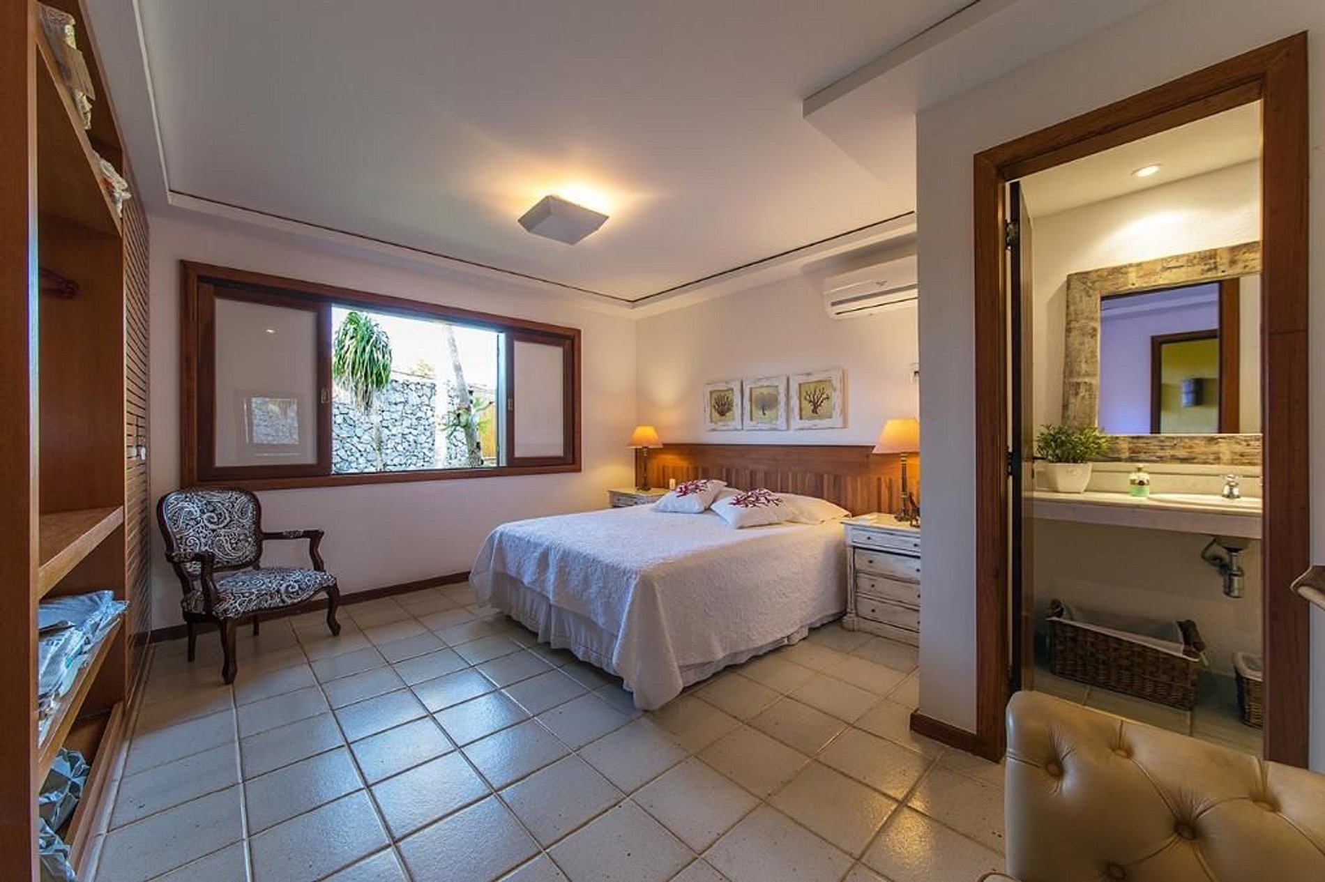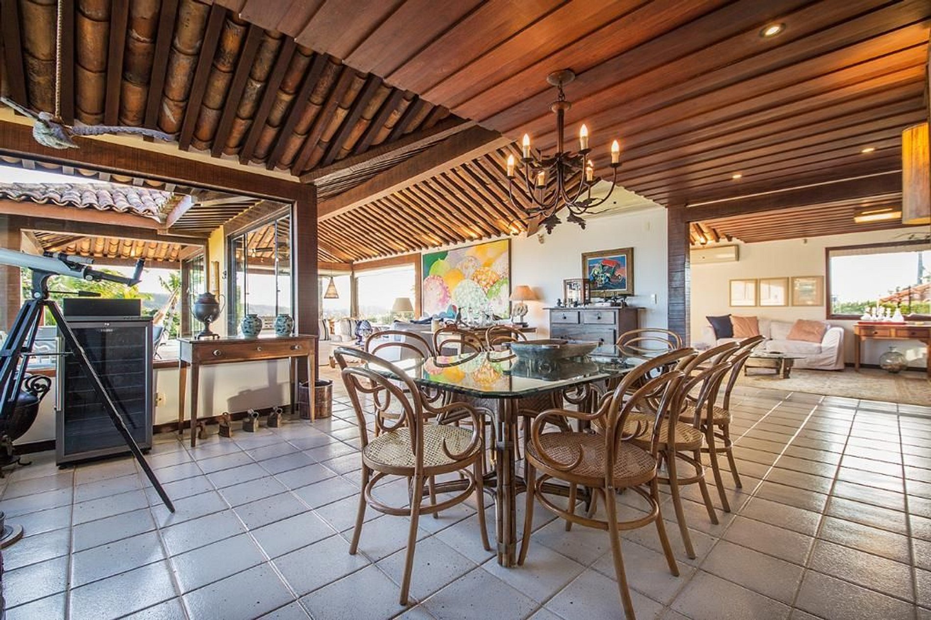 No piso principal da casa se encontra a cozinha, sala de TV, sala de jantar formal, sala de estar e varandas, áreas todas integradas e elegantemente decoradas no estilo praiano com toque artístico. Nesse mesmo piso também tem duas suítes com camas de casal, banheiro independente e vista para os jardins da casa.