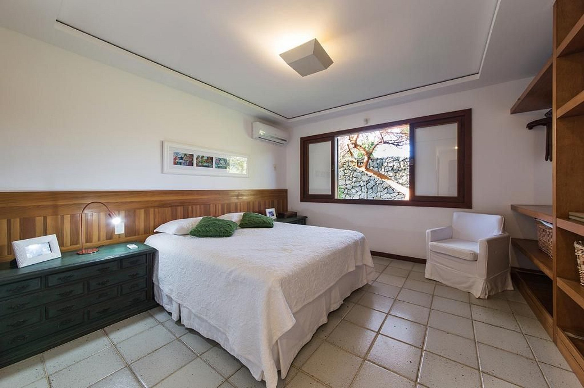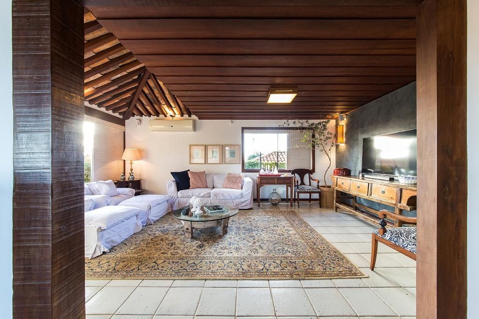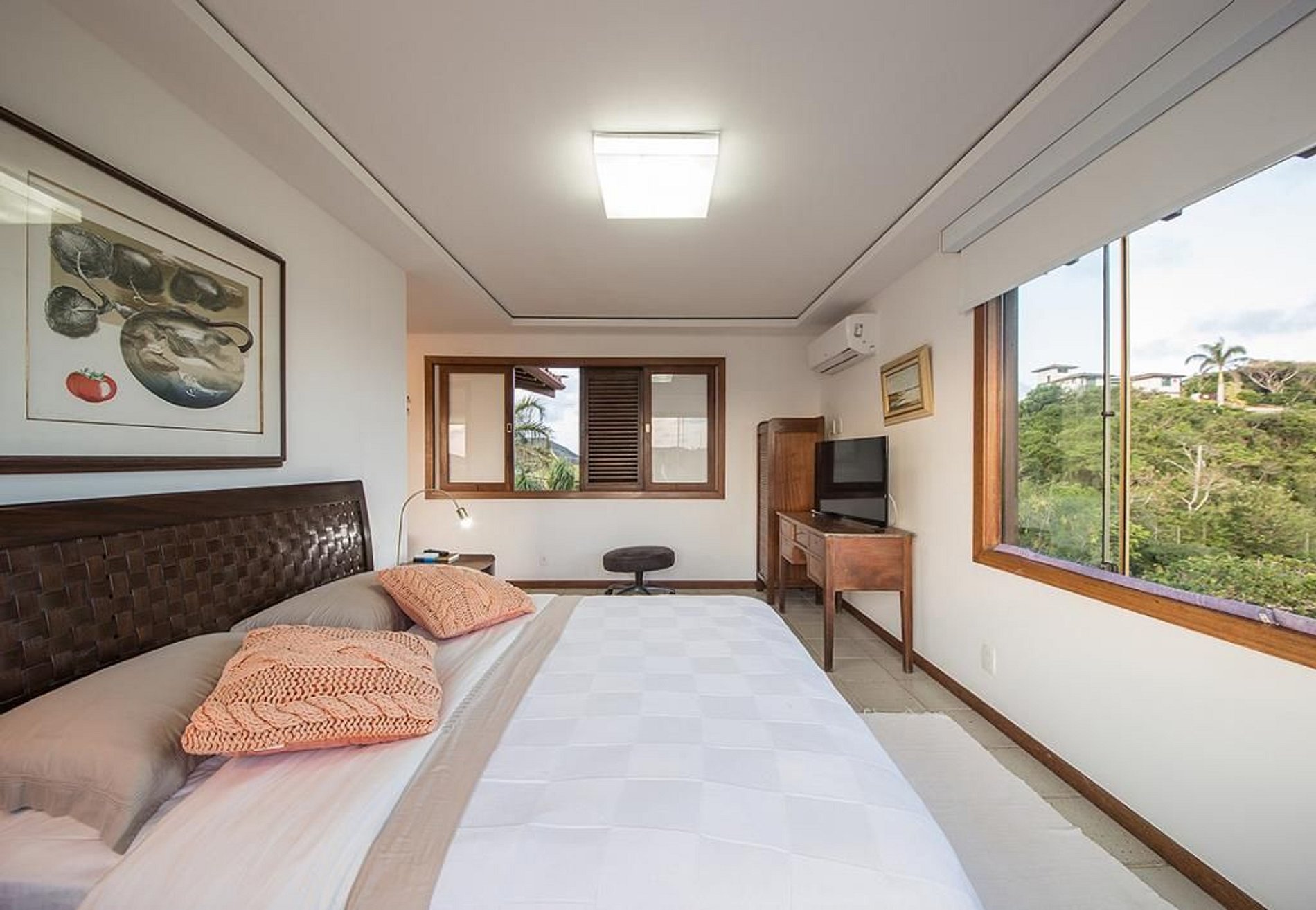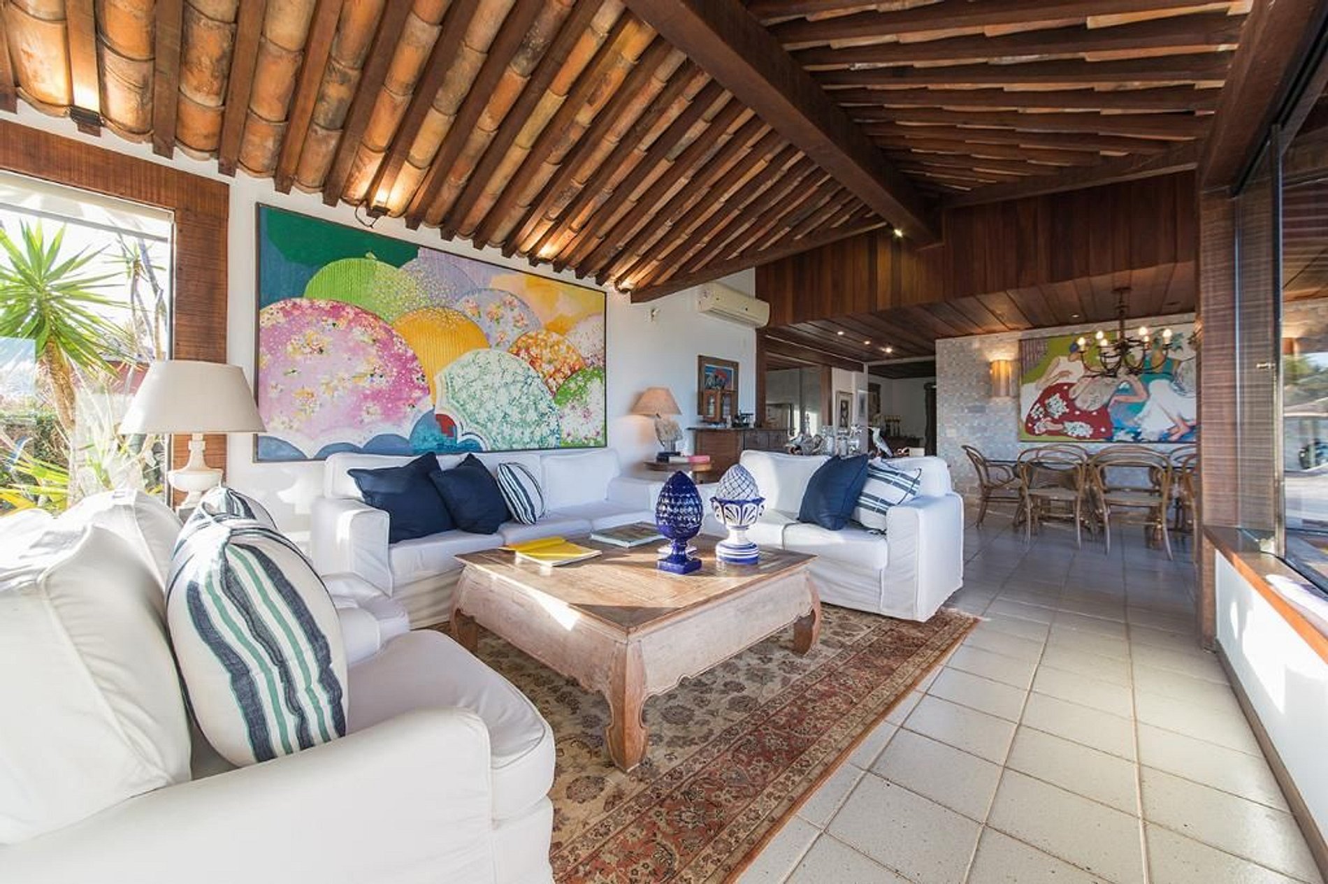 No piso principal da casa se encontra a cozinha, sala de TV, sala de jantar formal, sala de estar e varandas, áreas todas integradas e elegantemente decoradas no estilo praiano com toque artístico. Nesse mesmo piso também tem duas suítes com camas de casal, banheiro independente e vista para os jardins da casa.