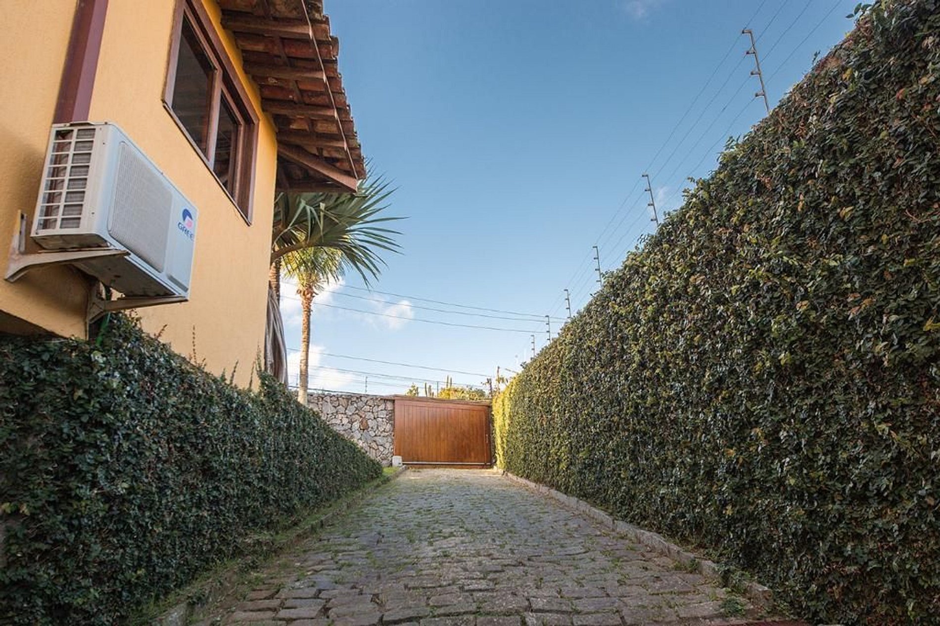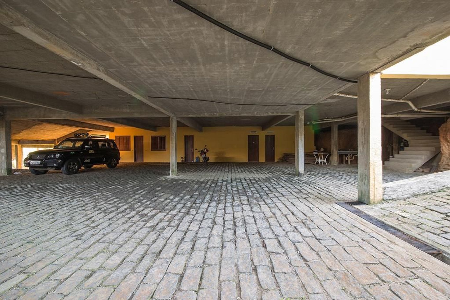 A casa tem uma garagem coberta que acomoda até 8 carros.