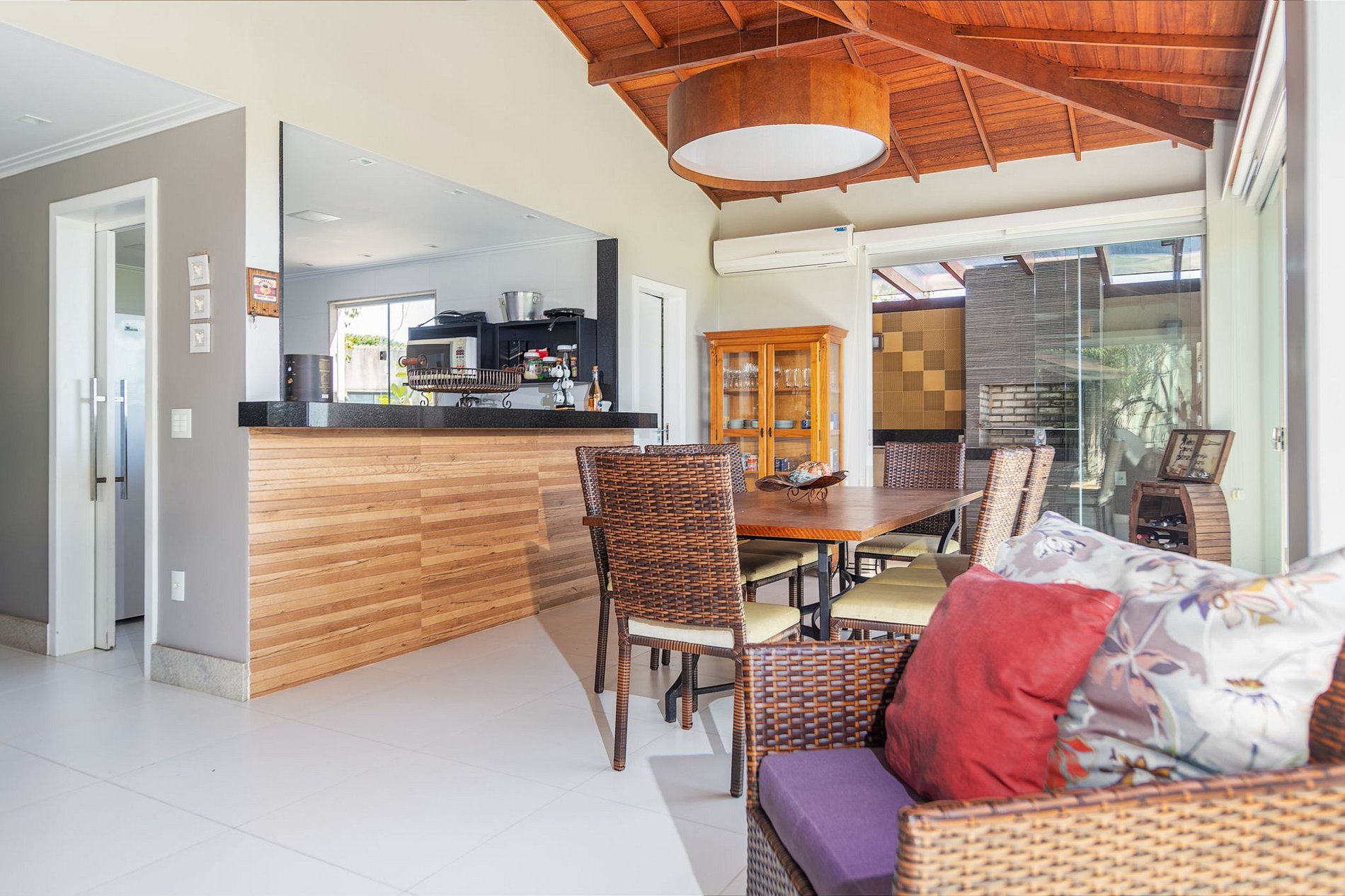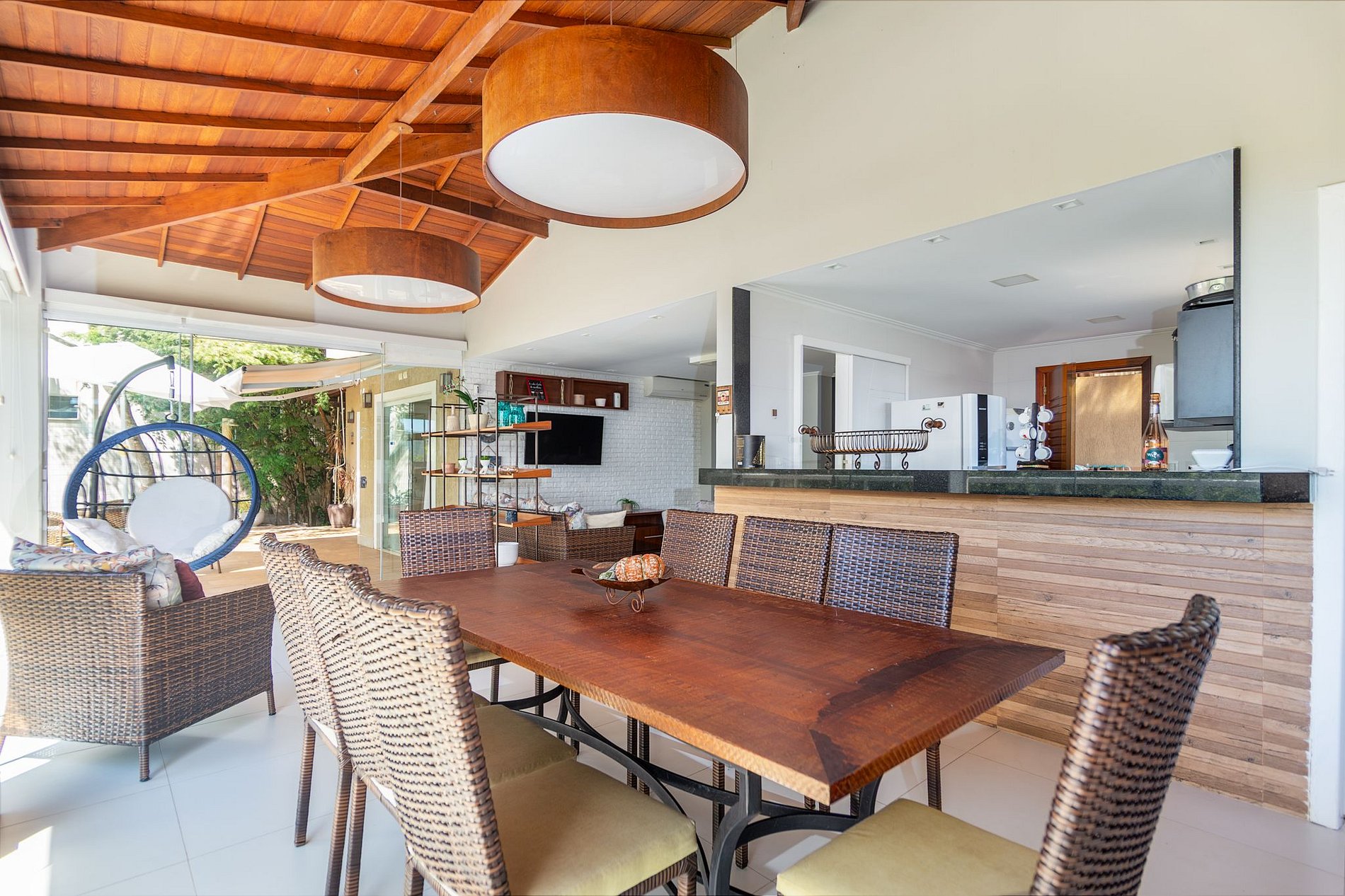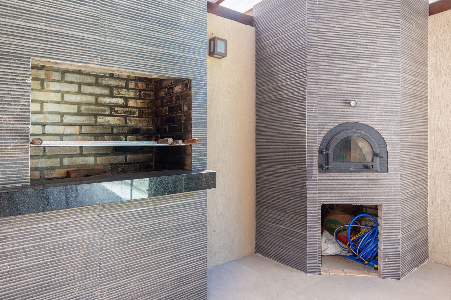 No área externa temos uma linda área gourmet com churrasqueira, forno à lenha e piscina privativa.