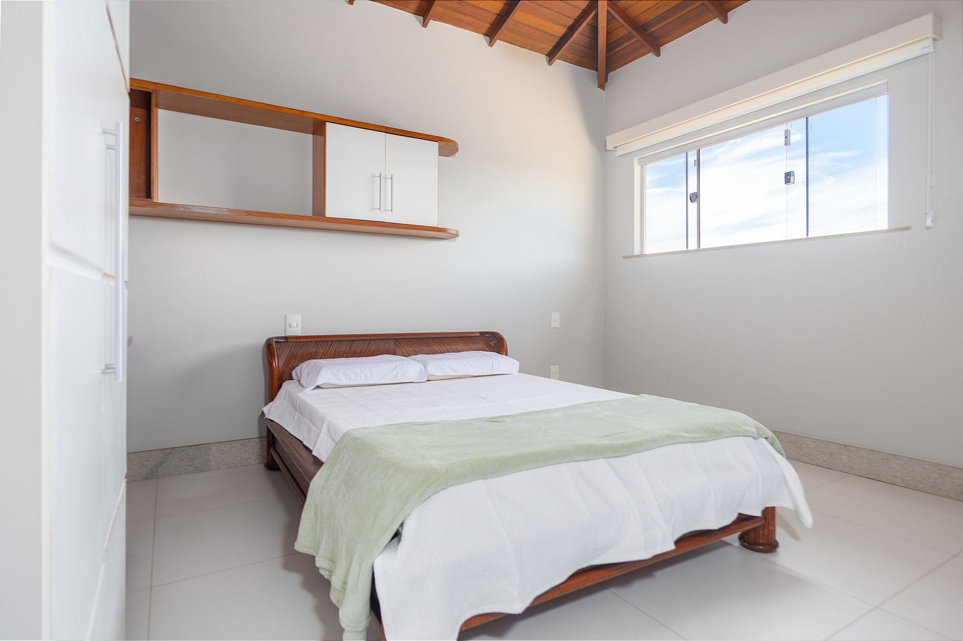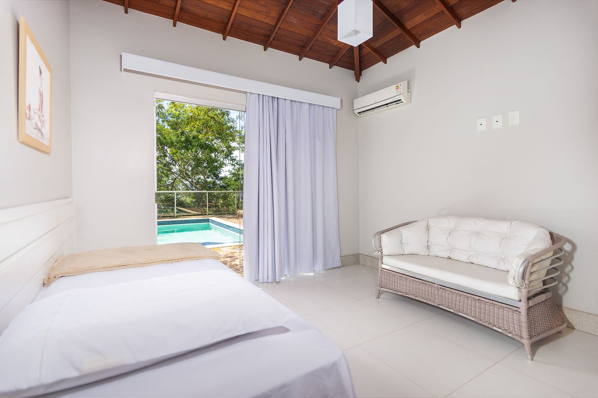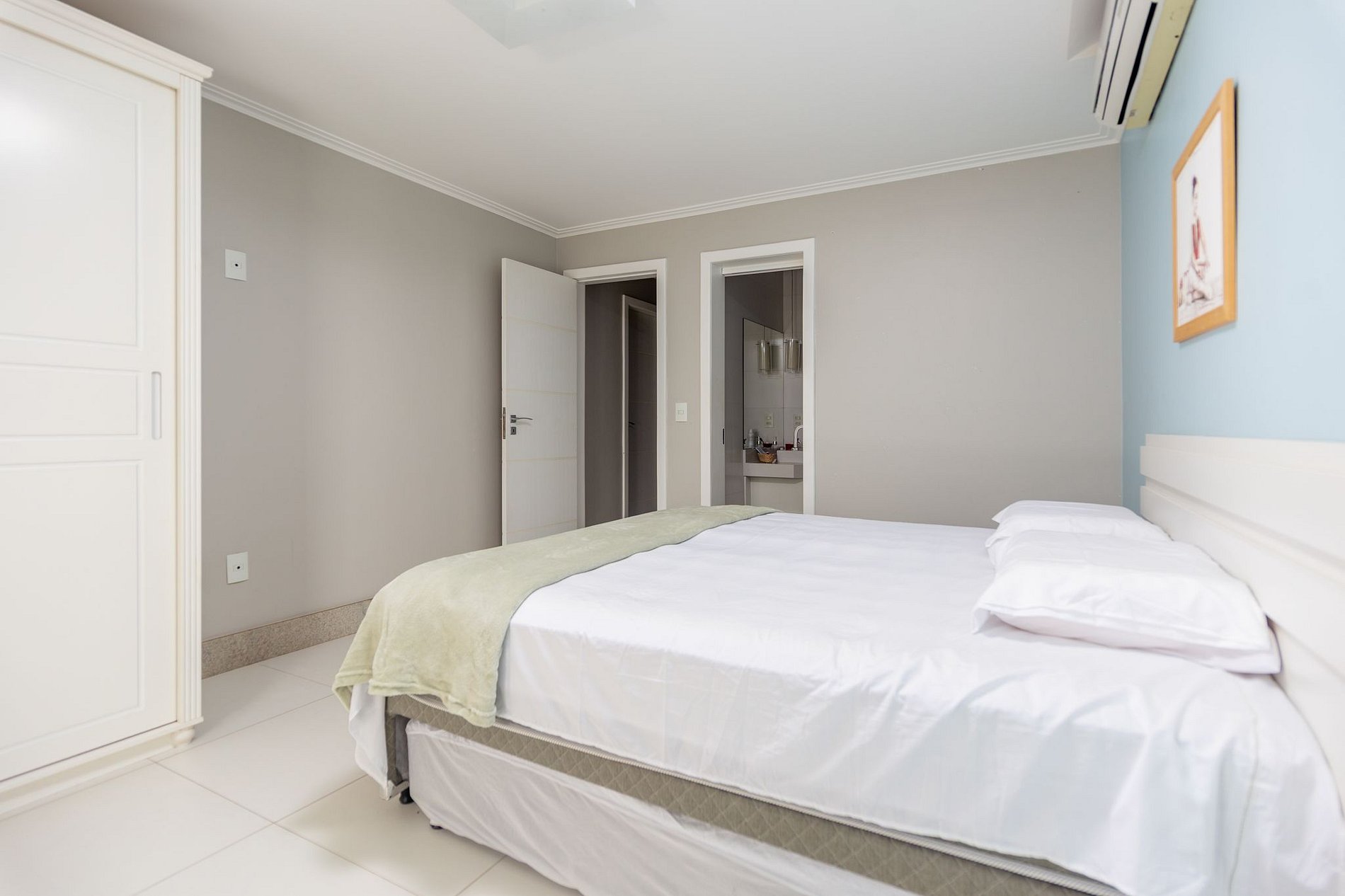 Cama de casal, ar condicionado split e banheiro