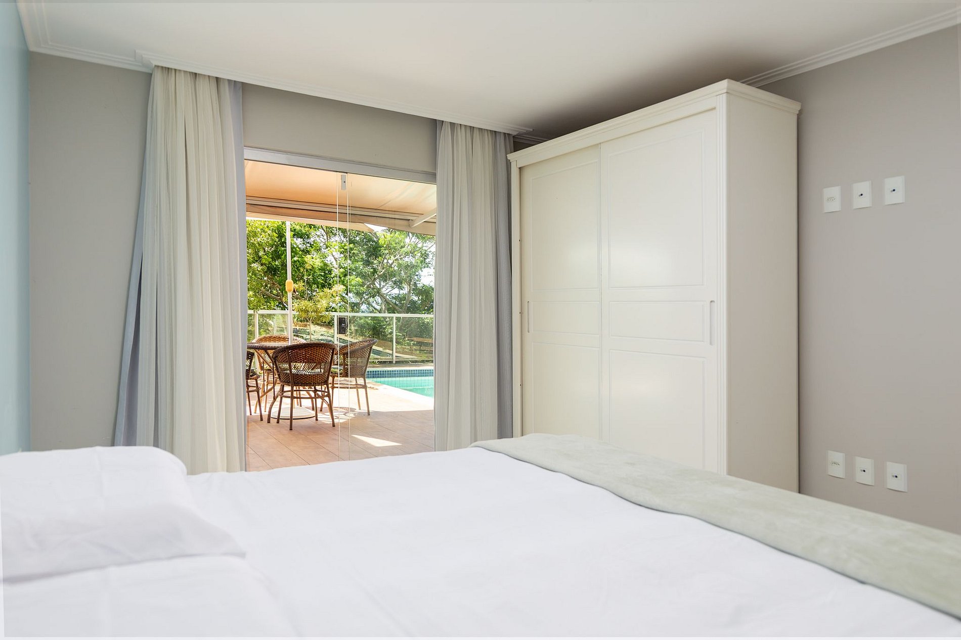 A luz consumida durante a estadia será cobrada ao final da locação. O valor é calculado mediante a leitura dos relógios na entrada e na saída dos hóspedes.