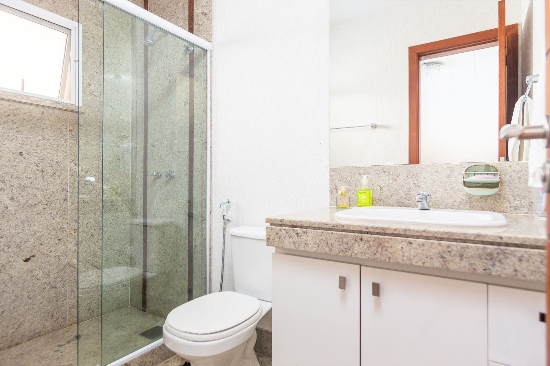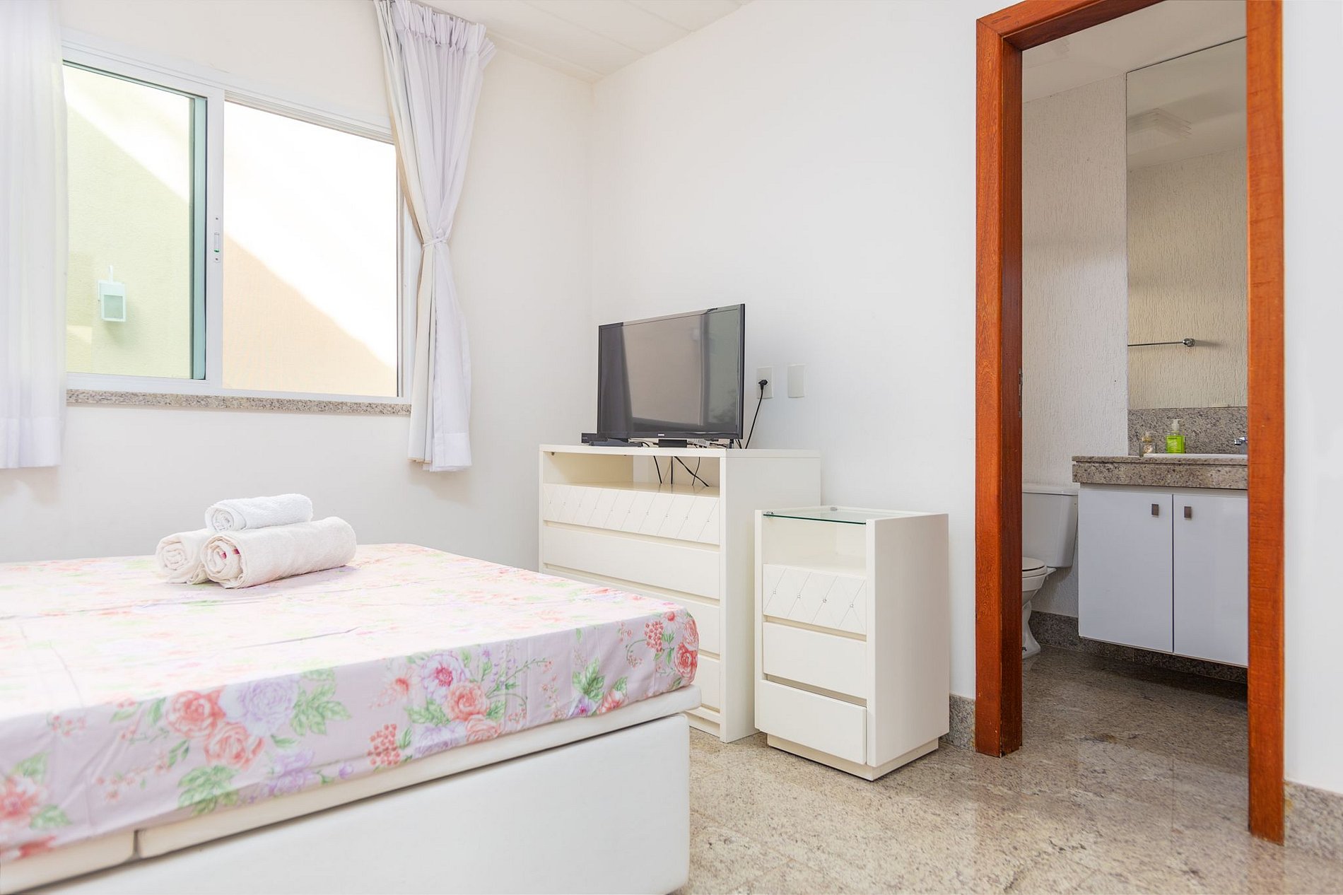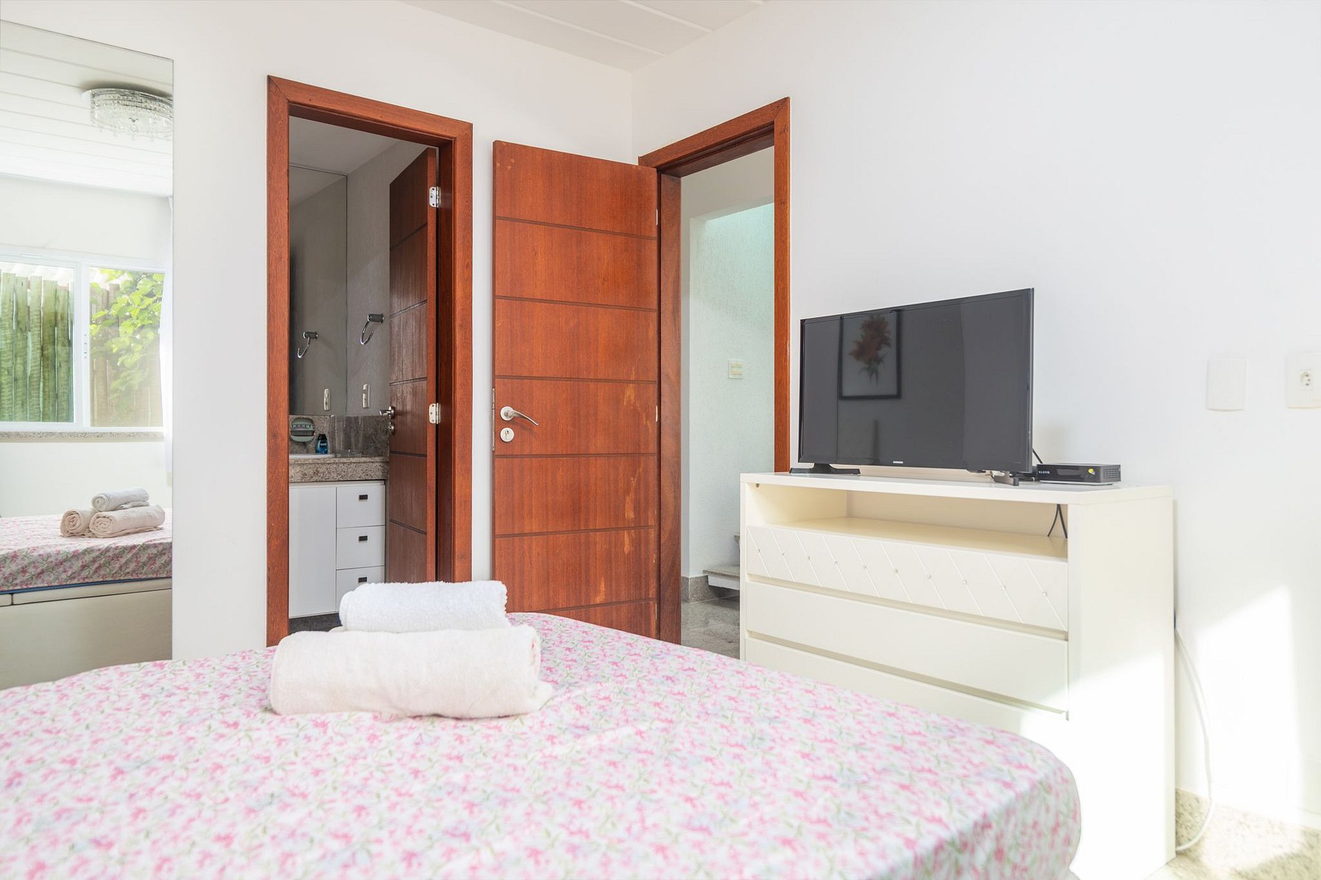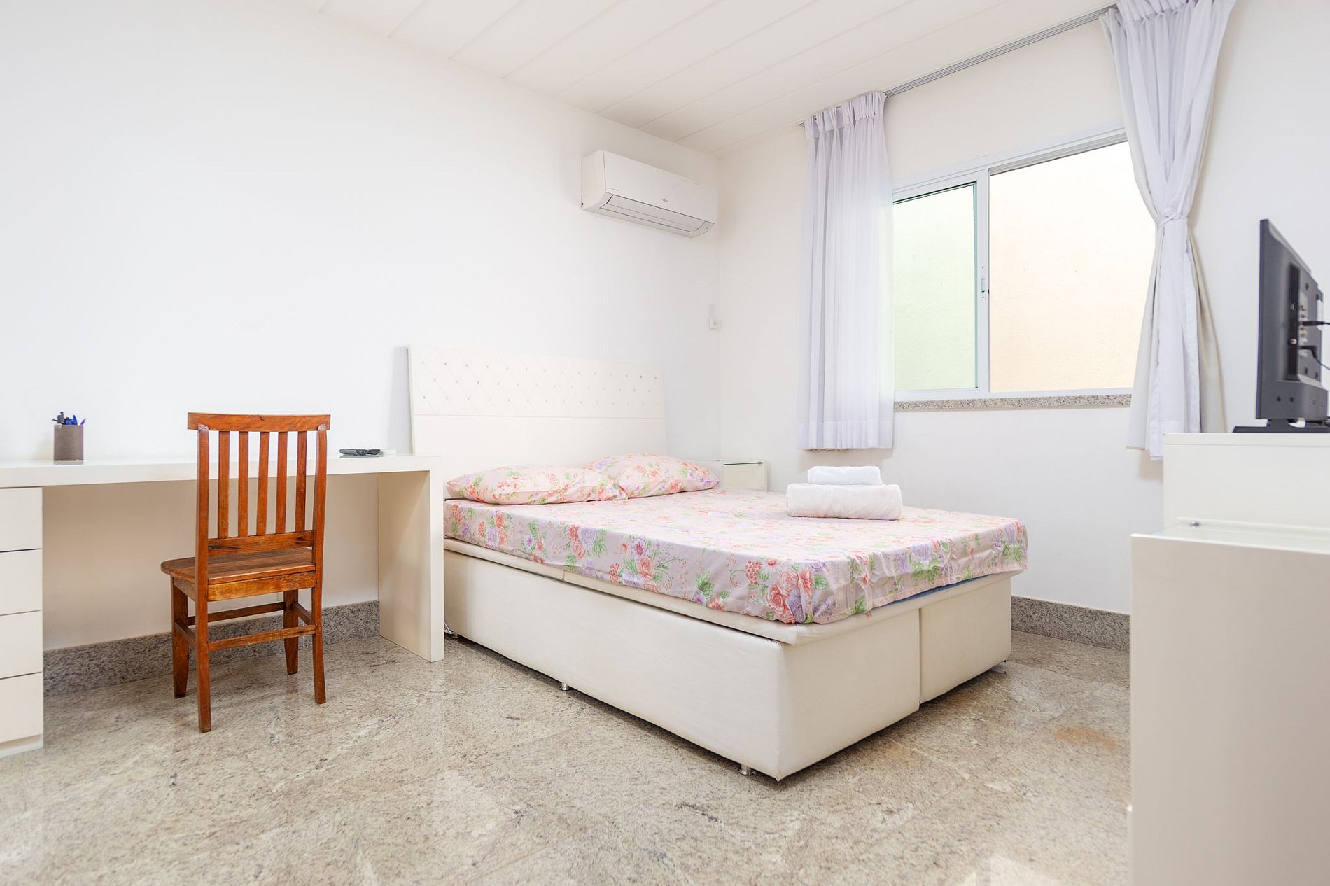 Cama de casal, ar condicionado split, tv e banheiro