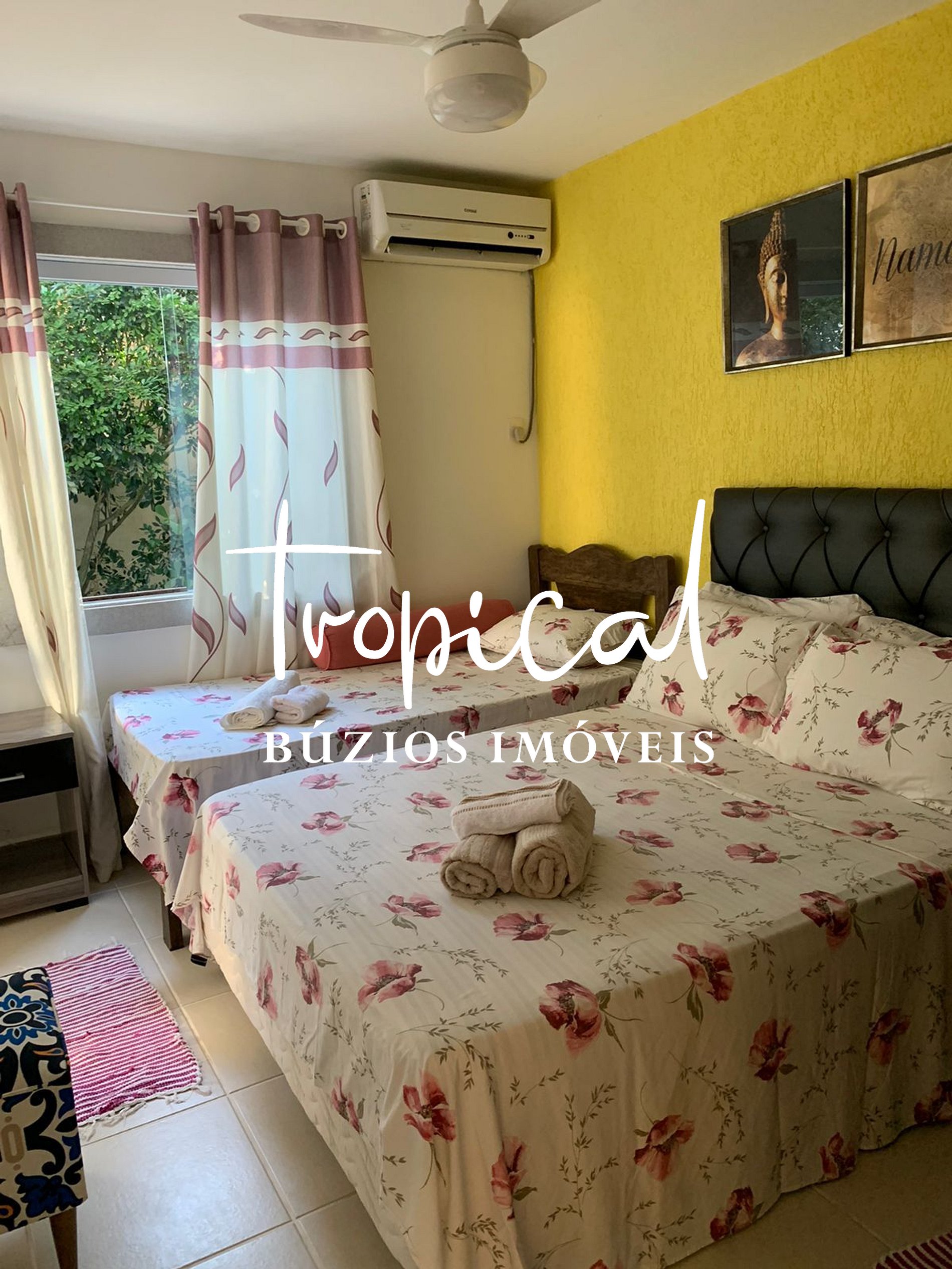 Cama de casal, cama de solteiro, ar condicionado split, ventilador de teto e banheiro