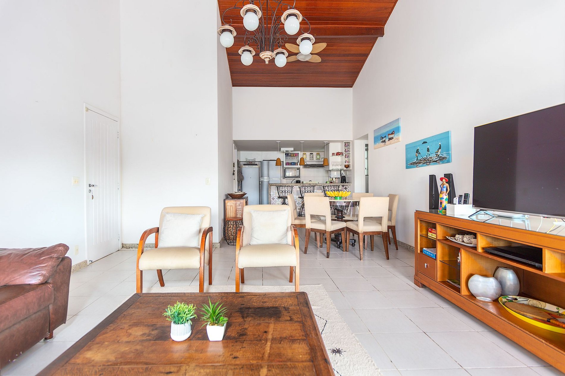 O imóvel é uma casa em condomínio fechado. A casa conta com 4 suítes sendo duas no primeiro pavimento e mais duas no pavimento superior, ampla sala, cozinha americana, área gourmet, piscina, sauna e sala de jogos com barzinho. A piscina e a sauna pertencem ao imóvel.