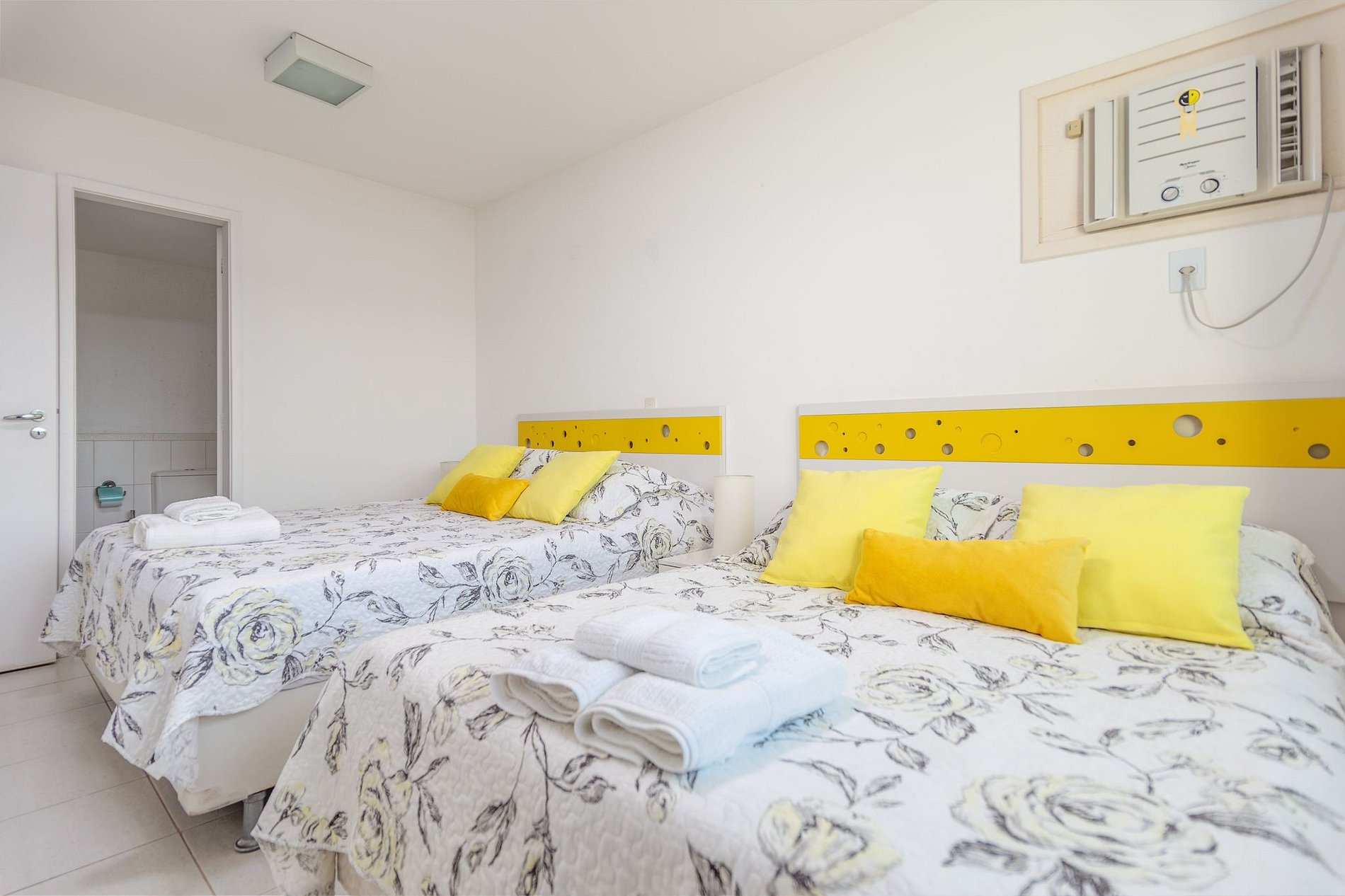 Quarto 2: Duas camas de casal, ar-condicionado e banheiro privativo