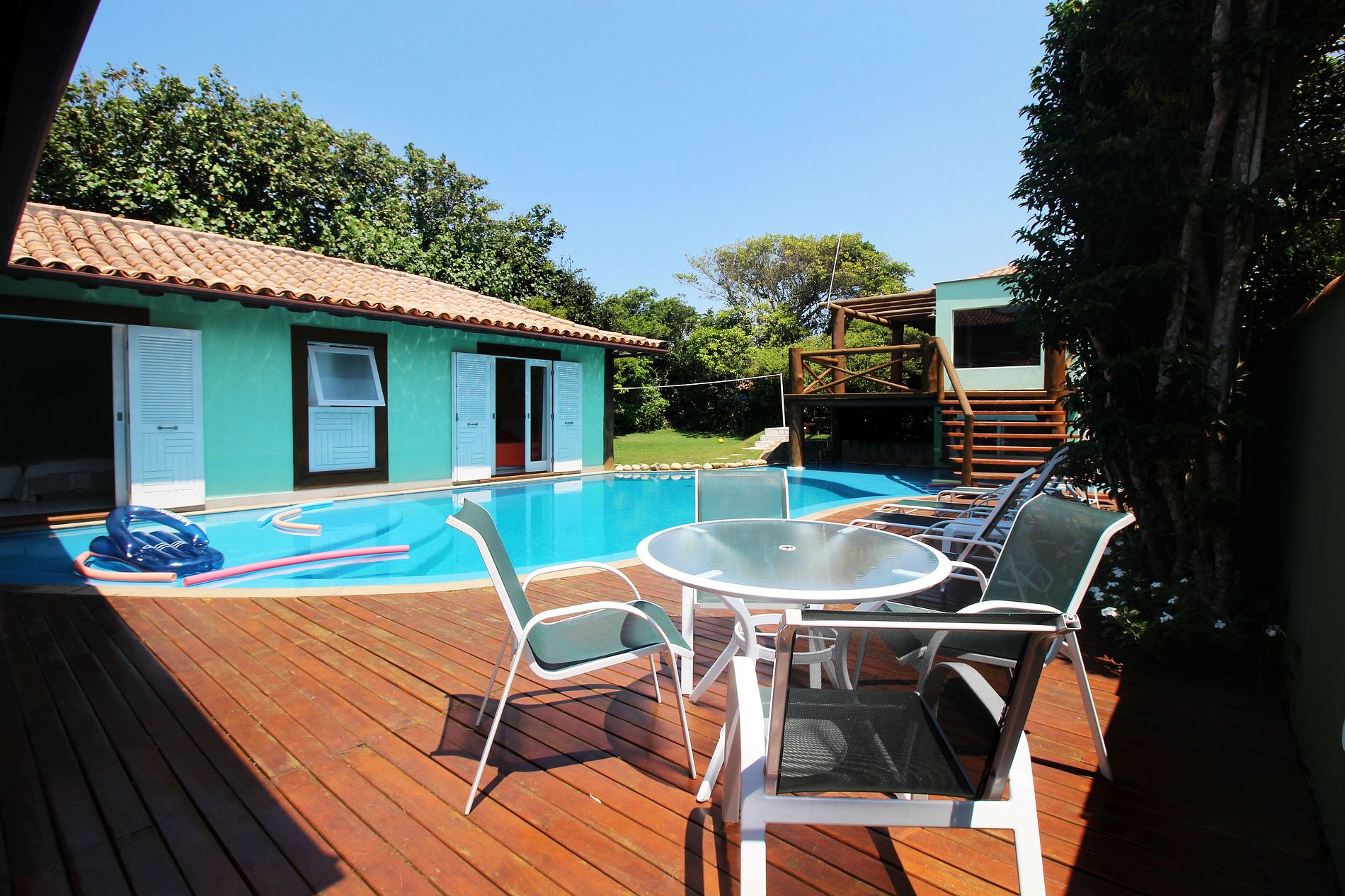 Quarto #4: uma (1) cama casal, ar-condicionado, banheiro particular, portas abrem direto pra piscina (1o andar)