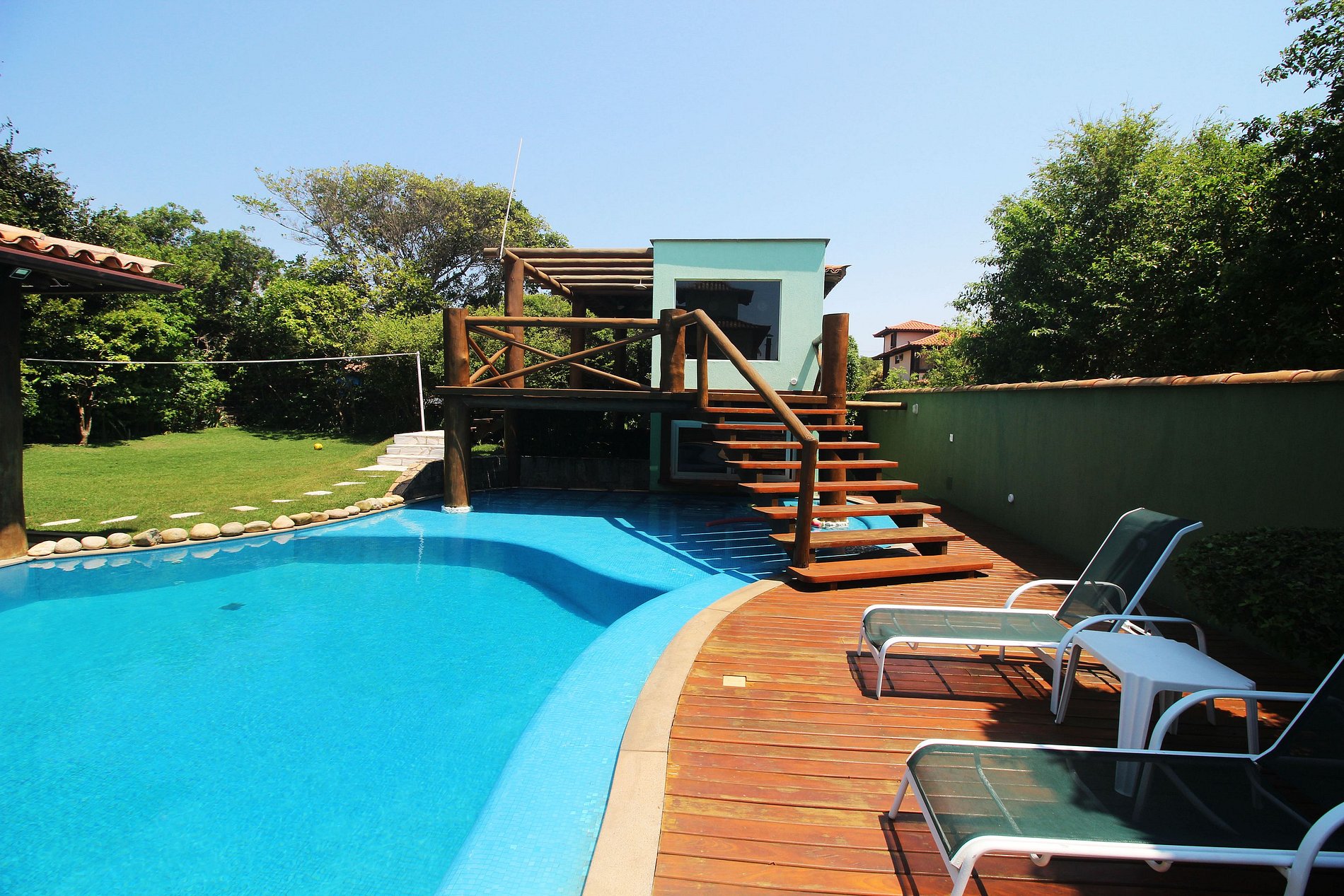 A área externa é maravilhosa e convidativa com jardins maduros e verdes que abraçam a casa. A piscina de borda molhada é a protagonista, se integrando entre o espaço gourmet, na esquerda duas suítes que abrem direto na ågua, na direita espreguiçadeiras e caminho para a espaço externo com área de jogos com mesa de sinuca, sauna, banheiro, gramado e rede de voley. O espaço gourmet, que é coberto, tem bastante espaço para os hóspedes se acomodarem, várias mesas, cadeiras e sofás, conta com forno de pizza a lenha, churrasqueira e geladeira.